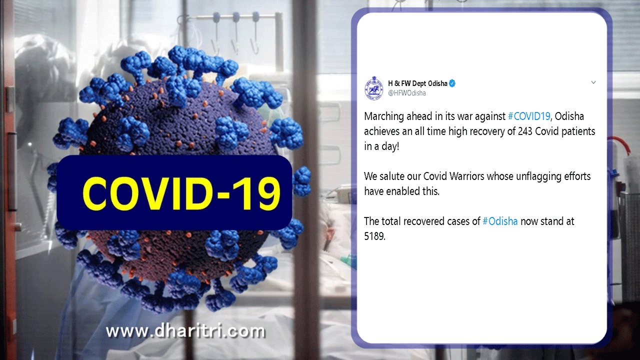 ଭୁବନେଶ୍ୱର,୩୦।୬(ବ୍ୟୁରୋ):ରାଜ୍ୟରେ ମଙ୍ଗଳବାର ୨୪୩ଜଣ କରୋନା ଆକ୍ରାନ୍ତ ସୁସ୍ଥ ହୋଇଛନ୍ତି। ଏନେଇ ସ୍ବାସ୍ଥ୍ୟ ଓ ପରିବାର କଲ୍ୟାଣ ବିଭାଗ ପକ୍ଷରୁ ଅପରାହ୍ନରେ ଟୁଇଟ୍ କରି ସୂଚନା ଦିଆଯାଇଛି।