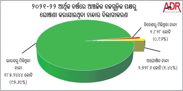 ନୂଆଦିଲ୍ଲୀ,୨୫ା୪:୨୦୨୧-୨୨ ଆର୍ଥତ୍କ ବର୍ଷରେ ଦେଶର ୨୬ଟି ଆଞ୍ଚଳିକ ଦଳଙ୍କୁ ମୋଟ ୧୮୯ କୋଟି ଟଙ୍କା ଚାନ୍ଦା ମିଳିଛି। ସେଥିରୁ ୮୫ ପ୍ରତିଶତ ଚାନ୍ଦା କେବଳ ୫ଟି ଦଳକୁ ଯାଇଛି। ତେବେ ବିଜେଡି, ଏଆଇଏଡିଏମ୍କେ, ଏନ୍ଡିପିପି, ଏସ୍ଡିଏଫ୍, ଏଆଇଏଫ୍ବି, ପିଏମ୍କେ ଏବଂ ଜେକେଏନ୍ସି ପାଇଥିବା ଚାନ୍ଦା ସମ୍ପର୍କରେ ଘୋଷଣା କରି ନ ଥିବା ଆସୋସିଏଶନ ଫର୍ ଡେମୋକ୍ରାଟିକ୍ ରିଫମର୍ସ (ଏଡିଆର୍) ରିପୋର୍ଟରେ କୁହାଯାଇଛି। ଏମାନଙ୍କୁ ବାଦ୍ ଦେଇ ଅନ୍ୟ ୨୬ ଆଞ୍ଚଳିକ ଦଳ ନିର୍ବାଚନ କମିଶନଙ୍କ ପାଖରେ ଦାଖଲ କରିଥିବା ଘୋଷଣାନାମା ଅନୁଯାୟୀ ସେମାନେ ୫,୧୦୦ଟି ଚାନ୍ଦାରୁ ମୋଟ ୧୮୯.୮୦୧ କୋଟି ଟଙ୍କା ପାଇଛନ୍ତି। ମୋଟ ଚାନ୍ଦାର ୮୫.୪୬ ପ୍ରତିଶତ ବା ୧୬୨.୨୧ କୋଟି ଟଙ୍କା ୫ଟି ଆଞ୍ଚଳିକ ଦଳକୁ ମିଳିଛି। ସେହି ଦଳଗୁଡ଼ିକ ହେଲେ ଟିଆର୍ଏସ୍, ଏଏପି, ଜେଡିୟୁ, ସମାଜବାଦୀ ପାର୍ଟି ଏବଂ ଓ୍ବାଇଏସ୍ଆର୍ କଂଗ୍ରେସ। ଟିଆର୍ଏସ୍, ଏଏପି, ସମାଜବାଦୀ ପାର୍ଟି ଏବଂ ଓ୍ବାଇଏସ୍ଆର୍ କଂଗ୍ରେସର ଚାନ୍ଦା ପରିମାଣ ପୂର୍ବ ବର୍ଷ ତୁଳନାରେ ବଢ଼ିଥିବାବେଳେ ଜେଡିୟୁ ଚାନ୍ଦା ହ୍ରାସ ପାଇଛି। ତେଲଙ୍ଗାନା ୧୪ ଚାନ୍ଦାରୁ ସର୍ବାଧିକ ୪୦.୯୦ କୋଟି ଟଙ୍କା ପାଇଥିବାବେଳେ ଏଏପି ୨,୬୧୯ଟି ଚାନ୍ଦାରୁ ମୋଟ ୩୮.୨୪ କୋଟି ପାଇଛି। ଜେଡିୟୁକୁ ୩୩.୨୬ କୋଟି ଟଙ୍କା ମିଳିଥିବାବେଳେ ଏସ୍ପି ଏବଂ ଓ୍ବାଇଏସ୍ଆର୍-କଂଗ୍ରେସ ଯଥାକ୍ରମେ ୨୯.୮୦ କୋଟି ଏବଂ ୨୦ କୋଟି ଟଙ୍କା ପାଇଥିବା ଏଡିଆର୍ ରିପୋର୍ଟରେ ଦର୍ଶାଯାଇଛି। ୨୦୨୦-୨୧ ବର୍ଷରେ ଆର୍ଏଲ୍ଟିପି, ଜେଏମ୍ଏମ୍, ପିଡିଏଫ୍ ଏବଂ ଡିଏମ୍ଡିକେ ଦଳକୁ ଆଦୌ ଚାନ୍ଦା ମିଳି ନ ଥିବାବେଳେ ୨୦୨୧-୨୨ ବର୍ଷରେ ସେମାନେ ଚାନ୍ଦା ପାଇଥିବା ଘୋଷଣା କରିଛନ୍ତି। ଆର୍ଏଲ୍ଟିପିକୁ ୩ ଲକ୍ଷ ଟଙ୍କା, ଜେଏମ୍ଏମ୍କୁ ୧ ଲକ୍ଷ, ପିଡିଏଫ୍କୁ ୮୦,୦୦୦ ଏବଂ ଡିଏମ୍ଡିକେକୁ ୫୦, ୦୦୦ ଟଙ୍କା ଚାନ୍ଦା ମିଳିଛି। ଏଆଇଏଡିଏମ୍କେ, ଏସ୍ଡିଏଫ୍, ଏଆଇଏଫ୍ବି, ପିଏମ୍କେ ଏବଂ ଏଆଇୟୁଡିଏଫ୍ ଚାନ୍ଦାରେ ସର୍ବାଧିକ ହ୍ରାସ ଘଟିଛି। ଅନ୍ୟପକ୍ଷରେ ବିଜେଡି, ଏନ୍ଡିପିପି ଏବଂ ଜେକେଏନ୍ସି ୨୦୨୦-୨୧ ଏବଂ ୨୦୨୧-୨୨ରେ ୨୦,୦୦୦ ଟଙ୍କାରୁ ଊର୍ଦ୍ଧ୍ୱ କୌଣସି ଚାନ୍ଦା ପାଇ ନ ଥିବା ଏଡିଆର୍ ରିପୋର୍ଟରେ କୁହାଯାଇଛି।