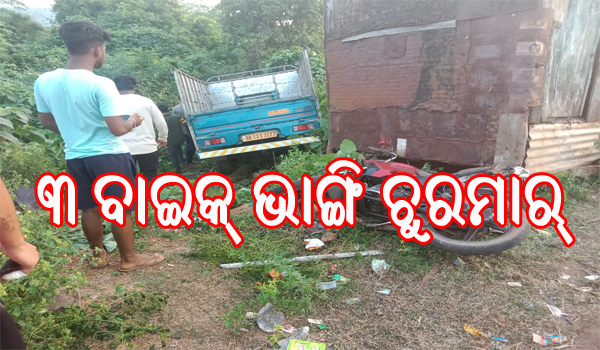 ନିରାକାରପୁର,୧୨।୧୦(ମାନସ ଚନ୍ଦ୍ର ପଟ୍ଟନାୟକ ): ଖୋର୍ଦ୍ଧା ଜିଲା ୧୬ ନମ୍ବର ଜାତୀୟ ରାଜପଥ ମା’ ଉଗ୍ରତାରାଙ୍କ ଫାଟକ ନିକଟରେ ଗୁରୁବାର ଏକ ଟ୍ରକ୍ ଧକ୍କାରେ ୩ ବାଇକ୍ ଭାଙ୍ଗି ଚୁରମାର୍ ହୋଇଯାଇଛି। ହେଲେ ଦୁର୍ଘଟଣାରେ ଉଠାଦୋକାନୀ ଅଳ୍ପକେ ମୃତ୍ୟୁ ମୁଖରୁ ରକ୍ଷା ପାଇଯାଇଛନ୍ତି।