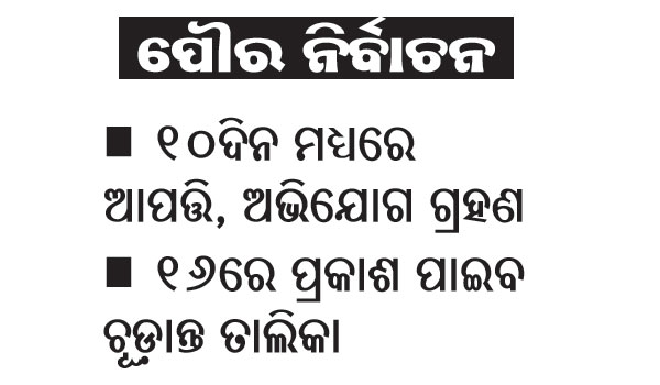 ଭୁବନେଶ୍ୱର,୮ା୧(ବ୍ୟୁରୋ): ପୌର ନିର୍ବାଚନ ପାଇଁ ଓ୍ବାର୍ଡ ପୁନର୍ଗଠନ ଓ ଆସନ ସଂରକ୍ଷଣ କାର୍ଯ୍ୟ ଜୋରସୋରରେ ଚାଲିଛି। ଶୁକ୍ରବାର ଗୃହ ଓ ନଗର ଉନ୍ନୟନ ବିଭାଗ ପକ୍ଷରୁ ଭୁବନେଶ୍ୱର ମହାନଗର ନିଗମର ୬୭, କଟକର ୫୯ ଏବଂ ବ୍ରହ୍ମପୁର ମହାନଗର ନିଗମର ୪୨ଟି ଓ୍ବାର୍ଡର ସୀମା ନିର୍ଦ୍ଧାରଣ ଓ ୫୦% ଆସନ ସଂରକ୍ଷଣ ଚିଠା ବିଜ୍ଞପ୍ତି ପ୍ରକାଶ କରାଯାଇଛି। ଆସନ୍ତା ୧୦ ଦିନ ମଧ୍ୟରେ ଏ ନେଇ ଆପତ୍ତି ଅଭିଯୋଗର ଶୁଣାଣି କରାଯିବ। ଆସନ୍ତା ୧୬ ତାରିଖରେ ଚୂଡ଼ାନ୍ତ ବିଜ୍ଞପ୍ତି ପ୍ରକାଶ କରାଯିବ।