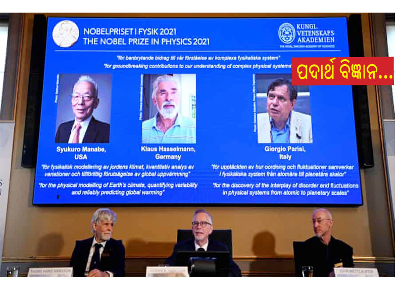 ଓ୍ବାଶିଂଟନ,୫।୧୦: ପଦାର୍ଥ ବିଜ୍ଞାନରେ ୨୦୨୧ରେ ୩ ଜଣ ବୈଜ୍ଞାନିକଙ୍କୁ ଉଲ୍ଲେଖନୀୟ ଅବଦାନ ପାଇଁ ନୋବେଲ ପୁରସ୍କାର ପ୍ରଦାନ କରାଯିବାକୁ ମଙ୍ଗଳବାର ଘୋଷଣା କରାଯାଇଛି। ସେମାନଙ୍କ ମଧ୍ୟରେ ଜାପାନର ସୋୟୁକୁରୁ ମାନାବେ, ଜର୍ମାନୀର କ୍ଲାଉସ୍ ହାସେଲମାନ୍ନ ଏବଂ ଇଟାଲୀର ଜିଓର୍ଜିଓ ପାରିସି ରହିଛନ୍ତି।