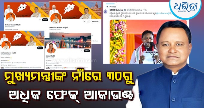 ତେବେ ସବୁଠାରୁ ଆଶ୍ଚର୍ଯ୍ୟକର କଥା ହେଉଛି ସମସ୍ତେ ମୁଖ୍ୟମନ୍ତ୍ରୀ ମୋହନଙ୍କ ବିଭିନ୍ନ ଆକାଉଣ୍ଟକୁ ଟ୍ୟାଗ୍ କରୁଛନ୍ତି। ଅର୍ଥାତ୍ ମୁଖ୍ୟମନ୍ତ୍ରୀ ଶପଥ ନେବା ପରଠାରୁ ଏବେଯାଏ ମୋହନଙ୍କ ନାମରେ ୩୦ରୁ ଅଧିକ ଫେକ୍ ଆକାଉଣ୍ଟ ସୋସିଆଲ ମିଡିଆରେ ଖୋଲାଯାଇଛି। ଆଉ ଏଥିରେ ବୁଧବାର ଠାରୁ ନୂଆନୂଆ ପୋଷ୍ଟ ମଧ୍ୟ କରାଯାଉଛି। ମୁଖ୍ୟମନ୍ତ୍ରୀଙ୍କ ବିଭିନ୍ନ ଗସ୍ତ ଠାରୁ ଆରମ୍ଭ କରି ବିଭିନ୍ନ ପ୍ରସ୍ତାବ ମଞ୍ଜୁରୀକୁ ନେଇ ମଧ୍ୟ ଳଗାତାର ପୋଷ୍ଟ କରାଯାଉଛି। ଏପରିକି ସିଏମଓ ଓଡ଼ିଶା ଓ ଭାଜପା ଓଡ଼ିଶା ଏକ୍ସ ହ୍ୟାଣ୍ଡେଲ ମଧ୍ୟ ଭିନ୍ନ ଭିନ୍ନ ଆଇଡିକୁ ଟ୍ୟାଗ କରିଛନ୍ତି। ମୁଖ୍ୟମନ୍ତ୍ରୀଙ୍କ ପ୍ରକୃତ ସରକାରୀ ଟ୍ବିଟର ହ୍ୟାଣ୍ଡେଲ ଜଣାପଡୁ ନ ଥିବାବେଳେ ୩୦ରୁ ଅଧିକ ଫେକ୍ ଆକାଉଣ୍ଟ ସୋସିଆଲ ମିଡିଆରେ ଘୁରି ବୁଲୁଛି। ପ୍ରକୃତ ଆଇଡି କେଉଁଟି ଜଣାପଡୁ ନଥିବାରୁ ୟୁଜର୍ସ ତାକୁ ଫଲୋ ମଧ୍ୟ କରୁଛନ୍ତି।