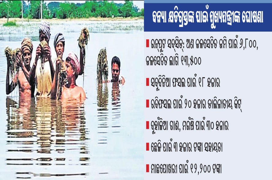 ଭୁବନେଶ୍ୱର,୧୨। ୯(ବ୍ୟୁରୋ): ଚଳିତ ବନ୍ୟା ଯୋଗୁ କ୍ଷତିଗ୍ରସ୍ତ ହୋଇଥିବା ଚାଷୀଙ୍କ ପାଇଁ ଶୁକ୍ରବାର ମୁଖ୍ୟମନ୍ତ୍ରୀ ନବୀନ ପଟ୍ଟନାୟକ ୩୦୦ କୋଟି ଟଙ୍କର ସ୍ବତନ୍ତ୍ର ପ୍ୟାକେଜ ଘୋଷଣା କରିଛନ୍ତି। ଗତ ଅଗଷ୍ଟ ଶେଷ ସପ୍ତାହରେ ରାଜ୍ୟର ବିଭିନ୍ନ ଜିଲାରେ ବନ୍ୟା ଯୋଗୁ ବହୁ ଶସ୍ୟହାନି ହୋଇଛି।