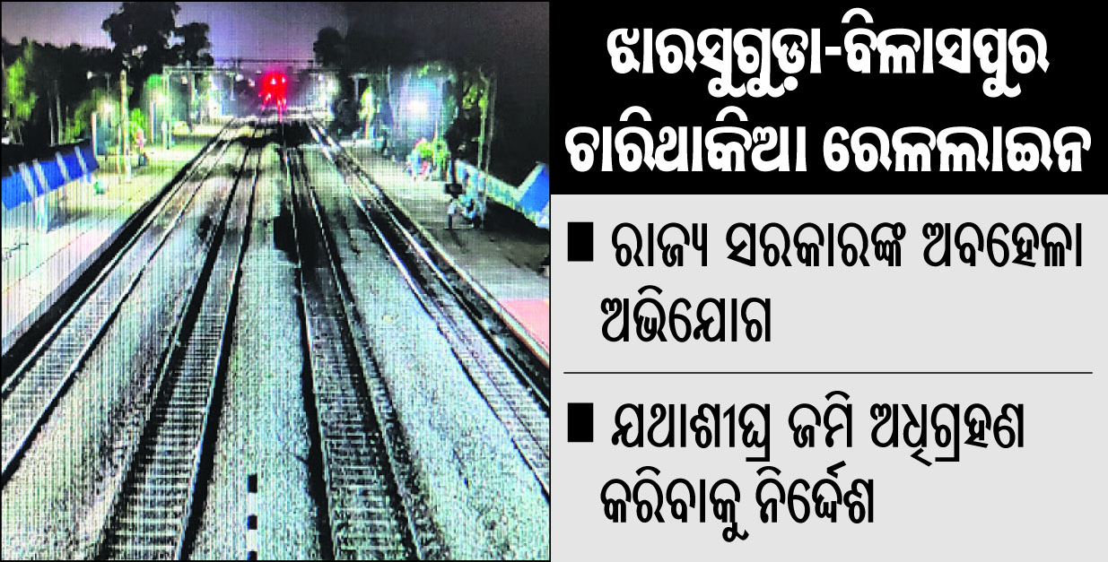 ଓଡ଼ିଶାରେ କେବଳ ଜମି ଅଧିଗ୍ରହଣ ପ୍ରକ୍ରିୟାରେ ବିଳମ୍ବ ଯୋଗୁ ୮ ପ୍ରକଳ୍ପ ଅଧାରେ ଅଟକିଛି। ଏଥିରେ ୪୬୨୬.୩୦ ହେକ୍ଟର ବେସରକାରୀ, ସରକାରୀ ଏବଂ ଜଙ୍ଗଲ ଜମି ଚିହ୍ନଟ ହୋଇଛି। ସେଥିରୁ ମାତ୍ର ୨୫୩୮.୨୮ ହେକ୍ଟର ଜମି ଅକ୍ତିଆର କରାଯାଇଛି। ଏଥିପାଇଁ ଆବଶ୍ୟକ କର୍ମଚାରୀ ଓ ପାଣ୍ଠି ମଞ୍ଜୁର ହୋଇ ପାରୁ ନ ଥିବାରୁ ଜମି ଅଧିଗ୍ରହଣ ସୁରୁଖୁରୁରେ ହୋଇ ପାରୁନାହିଁ ବୋଲି ପୂର୍ବରୁ ରାଜ୍ୟ ସରକାରଙ୍କ ପକ୍ଷରୁ କୁହାଯାଇଥିଲା। ସେଥିମଧ୍ୟରୁ ଦୀର୍ଘ ୨୫ ବର୍ଷ ହେଲା ଖୋର୍ଦ୍ଧାରୋଡ଼-ବଲାଙ୍ଗୀର ରେଳ ପ୍ରକଳ୍ପ ଲୋକଙ୍କ ସେବା ଅପେକ୍ଷାରେ ରହିଛି। ଇତିମଧ୍ୟରେ ଝାରସୁଗୁଡ଼ା-ବିଳାସପୁର ଚାରିଥାକିଆ ରେଳ ଲାଇନ ଅତି ଗୁରୁତ୍ୱପୂର୍ଣ୍ଣ ବୋଲି କୁହାଯାଉଛି। ଏଥିପାଇଁ ୨୦୧୮-୧୯ ବର୍ଷରେ ୨,୨୦୨ କୋଟି ଟଙ୍କା ମଞ୍ଜୁର ହୋଇଥିଲା। ଏଥିରେ କେବଳ ରେଳଲାଇନ ପାଇଁ ମାତ୍ର ୩.୧ ହେକ୍ଟର ବେସରକାରୀ ଜମି ଆବଶ୍ୟକ ହୋଇଛି। ଏହାବାଦ୍ ୯ କିମି ବିଶିଷ୍ଟ ଆଇବି ଫ୍ଲାଏଓଭର ନିର୍ମାଣ ପାଇଁ ୨୯.୬୧ ହେକ୍ଟର ବେସରକାରୀ ଜମି ଓ ୧୦.୫୭ ହେକ୍ଟର ସରକାରୀ ଜମି ଦରକାର ପଡୁଛି। ଓଡ଼ିଶା ସରକାରଙ୍କ ଦ୍ୱାରା ଜମି ଅଧିଗ୍ରହଣ କରିବାକୁ କେନ୍ଦ୍ର ସରକାର ନିଷ୍ପତ୍ତି ନେଇଥିବାବେଳେ ଝାରସୁଗୁଡ଼ା ଜିଲାପାଳ ଏଥିପାଇଁ ଆବଶ୍ୟକ ପଦକ୍ଷେପ ଗ୍ରହଣ କରିବେ ବୋଲି ମହାପ୍ରବନ୍ଧକ ଆଲୋକ କୁମାର ପରାମର୍ଶ ଦେଇଛନ୍ତି।