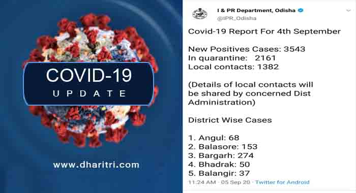 ଭୁବନେଶ୍ୱର,୫ା୯(ବ୍ୟୁରୋ): ଶନିବାର ମୋଟ୍ ୩୦ ଜିଲାରୁ ୩୫୪୩ ନୂଆ ପଜିଟିଭ୍ ଚିହ୍ନଟ ହୋଇଛନ୍ତି। ଏହାକୁ ମିଶାଇ ରାଜ୍ୟରେ ମୋଟ୍ ଆକ୍ରାନ୍ତଙ୍କ ସଂଖ୍ୟା ୧, ୨୦, ୨୨୧ରେ ପହଞ୍ଚିଥିବା ରାଜ୍ୟ ସୂଚନା ଓ ଲୋକ ସମ୍ପର୍କ ବିଭାଗ ସୂଚନା ଦେଇଛି। ଏଥିମଧ୍ୟରୁ କ୍ୱାରାଣ୍ଟାଇନ୍ରୁ ୨୧୬୧ଜଣ ଚିହ୍ନଟ ହୋଇଥିବା ବେଳେ ୧୩୮୨ ଜଣ ସ୍ଥାନୀୟ ସଂକ୍ରମିତ ଅଟନ୍ତି।