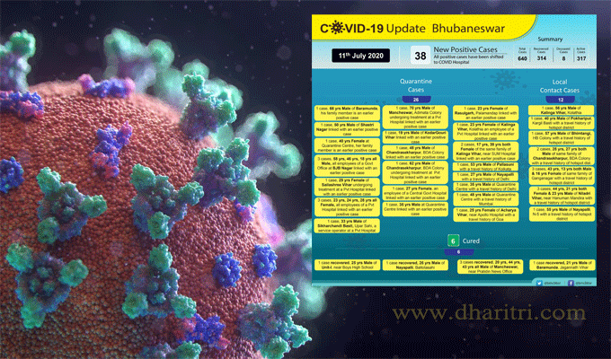 ନୂତନ କ୍ୱାରାଣ୍ଟାଇନ୍ କେସ୍ ମଧ୍ୟରେ ବରମୁଣ୍ଡାର ଜଣେ ୬୬ ବର୍ଷୀୟ ବୃଦ୍ଧ, ଶାସ୍ତ୍ରୀନଗରରୁ ୫୦ବର୍ଷୀୟ ବ୍ୟକ୍ତି, କ୍ୱାରାଣ୍ଟାଇନ୍ ସେଣ୍ଟରର ୪୦ ୧ବର୍ଷୀୟା ମହିଳା, ବିଜେବି ନଗରରେ ଥିବା ଏକ ସରକାରୀ ଅଫିସର ୩ଜଣ(୨୩,୨୪,୨୮ ବର୍ଷ), ଶିଖରଚଣ୍ଡି ବସ୍ତିର ୩୩ବର୍ଷୀୟ ବ୍ୟକ୍ତି, ମଞ୍ଚେଶ୍ୱରର ୭୦ବର୍ଷୀୟ ବୃଦ୍ଧ, କେଦାରଗୌରୀ ବିହାରର ୧୯ ବର୍ଷୀୟ ଯୁବକ, ଚନ୍ଦ୍ରଶେଖରପୁର ବିଡିଏ କଲୋନୀର ୪୮ବର୍ଷୀୟ ବ୍ୟକ୍ତି, ୬୨ ବର୍ଷୀୟ ବୃଦ୍ଧ, ସରକାରୀ ଡାକ୍ତରଖାନାର ଜଣେ ୨୭ ବର୍ଷୀୟ ମହିଳା, କ୍ୱାରାଣ୍ଟାଇନ୍ ସେଣ୍ଟରରେ ଥିବା ୩୫ବର୍ଷୀୟ ବ୍ୟକ୍ତି ଅଛନ୍ତି। ସେହିଭଳି ୧୨ ଲୋକାଲ୍ କେସ୍ ମଧ୍ୟରେ ରସୁଲଗଡ଼ ପାଲାମଣ୍ଡପ ଅଞ୍ଚଳର ୨୩ ବର୍ଷୀୟ ଯୁବତୀ, କଳିଙ୍ଗ ବିହାରର ୨୩ ବର୍ଷୀୟା ଯୁବତୀ, କଳିଙ୍ଗ ବିହାରର ସମ୍ ହସ୍ପିଟାଲ ନିକଟର ୨ଜଣ(୧୭ବର୍ଷ, ୩୯ବର୍ଷୀୟ ଯୁବତୀ), ପଳାଶୁଣୀର ୫୩ବର୍ଷୀୟ ବ୍ୟକ୍ତି, ନୟାପଲ୍ଲୀର ୨୭ ବର୍ଷୀୟ ବ୍ୟକ୍ତି, କ୍ୱାରାଣ୍ଟାଇନ୍ ସେଣ୍ଟରରେ ଥିବା ୩୫ ବର୍ଷୀୟ ପୁରୁଷ, ୪୮ବର୍ଷୀୟ ପୁରୁଷ,ଆଚାର୍ଯ୍ୟ ବିହାର ଆପୋଲୋ ହସ୍ପିଟାଲ ନିକଟରୁ ଜଣେ ୨୫ ବର୍ଷୀୟ ଯୁବତୀ, କଳିଙ୍ଗ ବିହାରର ୫୬ ବର୍ଷୀୟ ଯୁବକ, ପୋଖରୀପୁଟ ଅଞ୍ଚଳର ୪୦ବର୍ଷୀୟ ବ୍ୟକ୍ତି, ଭୀମଟାଙ୍ଗୀ ଅଞ୍ଚଳର ୫୭ ବର୍ଷୀୟ ବ୍ୟକ୍ତି, ଚନ୍ଦ୍ରଶେଖରପୁର ବିଡିଏ କଲୋନୀ ଅଞ୍ଚଳର ୨ଜଣ(୨୮ବର୍ଷ, ୨୭ବର୍ଷ ବ୍ୟକ୍ତି), ଗଙ୍ଗନଗରର ୩ଜଣ(୪୩, ୧୩ ବର୍ଷ ବ୍ୟକ୍ତି ଏବଂ ୧୬ବର୍ଷ ନାବାଳିକା), ନିଳାଦ୍ରିବିହାର ହନୁମାନ ମନ୍ଦିର ନିକଟରୁ ୩ଜଣ(୪୪ବର୍ଷ, ୨୧ ବର୍ଷ, ୨୩ ବର୍ଷ), ନୟାପଲ୍ଲୀର ୫୫ବର୍ଷୀୟ ବ୍ୟକ୍ତି ଥିବା ବିଏମ୍ସି ପକ୍ଷରୁ କୁହାଯାଇଛି।