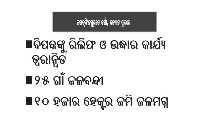 ଜଗତ୍ସିଂହପୁର ଅଫିସ, ୨୦।୮: ଜଗତ୍ସିଂହପୁର ଜିଲା ପ୍ରଶାସନର ଆକଳନ ଅନୁଯାୟୀ, ଶୁକ୍ରବାର ସୁଦ୍ଧା ଜିଲାର ୧୫୯ ପଞ୍ଚାୟତ ଅନ୍ତର୍ଗତ ୬୨୦ଟି ଗ୍ରାମର ୩୯,୭୯୩ ଲୋକ, ୧୭,୭୬୦ ଗୋସମ୍ପଦ ବନ୍ୟା ଦ୍ୱାରା ପ୍ରଭାବିତ ହୋଇଛନ୍ତି। ସେଥିମଧ୍ୟରୁ ୨୫ଟି ଗାଁ ଜଳାର୍ଣ୍ଣବ ହୋଇଥିବେଳେ ସେଠାରେ ଥିବା ୧୭,୫୭୮ ଲୋକ ପ୍ରଭାବିତ ହୋଇଛନ୍ତି। ୪୨ଟି କଚାଘର ଓ ୩୬ଟି ଗୁହାଳ କ୍ଷତିଗ୍ରସ୍ତ ହୋଇଛି। ୧୦,୨୭୬ ହେକ୍ଟର ଜମି ଜଳମଗ୍ନ ହୋଇଯାଇଛି। ସେଥିରୁ ଉଦ୍ୟାନ କୃଷିର ୯୬ ହେକ୍ଟର ଜମିରେ ହୋଇଥିବା ପନିପରିବା ଚାଷ ନଷ୍ଟ ହୋଇଯାଇଛି। ଜିଲା ପ୍ରଶାସନ ପକ୍ଷରୁ ଏପର୍ଯ୍ୟନ୍ତ ୧୫,୨୮୮ ଲୋକଙ୍କୁ ମାଗଣା ରନ୍ଧା ଖାଦ୍ୟ ଯୋଗାଇ ଦିଆଯାଇଥିବାବେଳେ ୧୬୧.୨ କୁଇଣ୍ଟାଲ ଚୁଡା, ୪୦.୫୯ କୁଇଣ୍ଟାଲ ଗୁଡ଼ ବଣ୍ଟନ କରାଯାଇଛି। ୧୪ଟି ମେଡିକାଲ ଓ ୧୯ଟି ପ୍ରାଣୀ ସମ୍ପଦ ବିଭାଗର ଡାକ୍ତରୀ ଦଳ ନିୟୋଜିତ ହୋଇଛନ୍ତି। ୬୯୪ ରୋଲ ପଲିଥିନ ବଣ୍ଟନ ହୋଇପାରିଛି। ମୋଟାମୋଟି ଭାବେ ଜିଲା ପ୍ରଶାସନ ପକ୍ଷରୁ ବନ୍ୟାଞ୍ଚଳରେ ରିଲିଫ୍ ଓ ଉଦ୍ଧାର କାର୍ଯ୍ୟ ତ୍ୱରାନ୍ବିତ କରାଯାଇଥିବା ସୂଚନା ଦିଆଯାଇଛି। ଜିଲାପାଳ ପାରୁଲ ପଟାୱରୀ ଶୁକ୍ରବାର ଅପରାହ୍ନରେ କୁଜଙ୍ଗ ବ୍ଲକର ଜିଲାନାସୀ, ଜୟଶଙ୍ଖପୁର, ତେନ୍ତୁଳିଆ, ବରିହାଡିହା ଅଞ୍ଚଳ ଗସ୍ତ କରି ବନ୍ୟା ପ୍ରପୀଡିତଙ୍କ ଅଭାବ, ଅସୁବିଧା ବୁଝିଥିଲେ। ଜିଲାର ୮ ବ୍ଲକରେ ପ୍ରଶାସନ ପକ୍ଷରୁ ଶୁଖିଲା, ରନ୍ଧା ଖାଦ୍ୟ ଆଶ୍ରୟସ୍ଥଳରେ ଥିବା ଲୋକଙ୍କୁ ପ୍ରଦାନ କରାଯାଇଛି। ଏଥିସହ ଗୋସମ୍ପଦଙ୍କୁ ଗୋଖାଦ୍ୟ ଯୋଗାଇବା ପ୍ରକ୍ରିୟା ଚାଲିଛି। ତହସିଲଦାରମାନେ ପଲିଥିନ ବଣ୍ଟନ ଦାୟିତ୍ୱରେ ଅଛନ୍ତି। ରିଲିଫ କାର୍ଯ୍ୟରେ ଜନପ୍ରତିନିଧିଙ୍କ ସହାୟତାରେ ଅଧିକାରୀମାନେ କାର୍ଯ୍ୟ କରୁଛନ୍ତି। ୩ଟି ମୋବାଇଲ ୱାଟର ଟ୍ରିଟ୍ମେଣ୍ଟ ପ୍ଲାଣ୍ଟ ସ୍ଥାପନ କରାଯାଇ ପାନୀୟ ଜଳ ପାଉଚ ମାଧ୍ୟମରେ ଯୋଗାଣ ବ୍ୟବସ୍ଥା ହେଉଛି। ସ୍ବାସ୍ଥ୍ୟ, ପ୍ରାଣୀ ସମ୍ପଦ ବିଭାଗ ପକ୍ଷରୁ ଶିବିର ମାଧ୍ୟମରେ ଲୋକ ଓ ଗୋ ସମ୍ପଦକଙ୍କ ପାଇଁ ଔଷଧ ଯୋଗାଇ ଦିଆଯାଉଛି। ୩ ଦିନ ହେବ ବରିଷ୍ଠ ଅଧିକାରୀମାନେ ରିଲିଫ ଓ ଉଦ୍ଧାର କାର୍ଯ୍ୟ ପରିଚାଳନା କରୁଛନ୍ତି। ଏନ୍ଡିଆର୍ଏଫ୍, ଓଡ୍ରାଫ୍ ଓ ଅଗ୍ନିଶମ ବାହିନୀ ସହ ଗ୍ରାମୀଣ ଜଳ ଯୋଗାଣ ଓ ପରିମଳ, ସ୍ବାସ୍ଥ୍ୟ, ପ୍ରାଣୀ ସମ୍ପଦ, ପଞ୍ଚାୟତିରାଜ ବିଭାଗ କର୍ମଚାରୀମାନେ ଦାୟିତ୍ୱରେ ଅଛନ୍ତି। ମୁଖ୍ୟମନ୍ତ୍ରୀ ୧୬ଦିନ ପାଇଁ ରିଲିଫ୍ ପାଇଁ ନିର୍ଦ୍ଦେଶ ଦେଇଥିବାରୁ ଏହା ପହଞ୍ଚାଇବା ଉପରେ ଗୁରୁତ୍ୱାରୋପ କରାଯାଉଛି। ଜଗତ୍ସିଂହପୁର ଦୁଗ୍ଧ ଉତ୍ପାଦନରେ ୧ନମ୍ବର ଥିବାରୁ ଗୋ ସମ୍ପଦର ସୁରକ୍ଷା ଉପରେ ପ୍ରାଧାନ୍ୟ ଦେବାକୁ ଜିଲାପାଳ ପରାମର୍ଶ ଦେଇଛନ୍ତି।