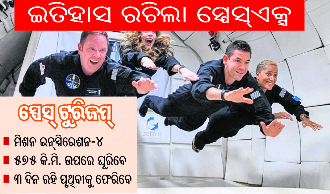 ଓ୍ବାଶିଂଟନ୍, ୧୭ା୯: ସ୍ପେସ୍ ଟୁରିଜମ୍ ବା ମହାକାଶ ପର୍ଯ୍ୟଟନ ଇତିହାସରେ ଆଉ ଏକ ଫର୍ଦ୍ଦ ଯୋଡ଼ିଛି ଆମେରିକାର ବିଶିଷ୍ଟ ବ୍ୟବସାୟୀ ଏଲନ୍ ମସ୍କଙ୍କ କମ୍ପାନୀ ସ୍ସେସ୍ଏକ୍ସ। ବୁଧବାର ପ୍ରଥମ ଥର ପାଇଁ କୌଣସି ବୃତ୍ତିଗତ ମହାକାଶଚାରୀଙ୍କ ବଦଳରେ ୪ ସାଧାରଣ ନାଗରିକ ବା ଅଲ୍-ସିଭିଲିଆନ୍ କ୍ରିଉଙ୍କୁ ସ୍ପେସ୍ଏକ୍ସ ମହାକାଶ ଯାତ୍ରା ନିମନ୍ତେ ପୃଥିବୀ କକ୍ଷକୁ ପଠାଇଛି। ଇନସ୍ପିରେଶନ-୪ ନାମରେ ନାମିତ ହୋଇଥିବା ଏହି ମିଶନରେ ସ୍ପେସ୍ ପର୍ଯ୍ୟଟକଙ୍କ ମଧ୍ୟରେ ଜଣେ ଇ-କମର୍ସ ଏକ୍ଜିକ୍ୟୁଟିଭ୍ ବିଲିଅନେୟର ରହିଥିବାବେଳେ ଅନ୍ୟ ୩ ଜଣ ହେଉଛନ୍ତି ସାଧାରଣ ନାଗରିକ।