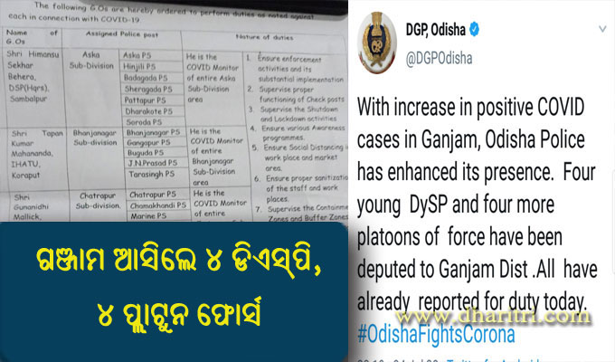 ଏଥିସହ ଜିଲାର ବିଭିନ୍ନ ଥାନାକୁ ଫୋର୍ସ ପଠାଯାଇଛି ୪ ଜଣ ଡିଏସପି ଚେକପୋଷ୍ଟ, ଶଟଡାଉନ, ଲକଡାଉନ, ସଚେତନତା କାର୍ଯ୍ୟକ୍ରମ, ସୋସିଆଲ ଡିଷ୍ଟାନ୍ସ, ସାନିଟାଇଜେସନ, ଆକ୍ରାନ୍ତ ପୋଲିସ ଅଧିକାରୀ ଓ କର୍ମଚାରୀଙ୍କ ସ୍ବାସ୍ଥ୍ୟବସ୍ଥା, ହୋମ କ୍ୱାରାଣ୍ଟାଇନ, ଅଣ ଅତ୍ୟାବଶ୍ୟକୀୟ ସାମଗ୍ରୀ ନେବା କଟକଣା ଆଦିର ସୁପରଭାଇଜ କରିବେ ବୋଲି ସୂଚନା ଦିଆଯାଇଛି।