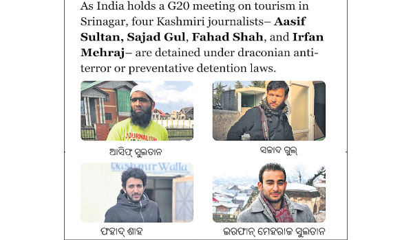 ୨୦୧୯ ଅଗଷ୍ଟ ୫ରେ କେନ୍ଦ୍ର ସରକାର ଜମ୍ମୁ-କଶ୍ମୀରକୁ ସ୍ବତନ୍ତ୍ର ମାନ୍ୟତା ପ୍ରଦାନକାରୀ ସମ୍ବିଧାନର ଅନୁଚ୍ଛେଦ ୩୭୦କୁ ଉଚ୍ଛେଦ କରିଥିଲେ। ପ୍ରଧାନମନ୍ତ୍ରୀ ନରେନ୍ଦ୍ର ମୋଦିଙ୍କ ହିନ୍ଦୁ ଜାତୀୟତାବାଦୀ ସରକାର ଜମ୍ମୁ-କଶ୍ମୀରକୁ କେନ୍ଦ୍ରଶାସିତ ଅଞ୍ଚଳରେ ପରିଣତ କରି ଏହାର ସ୍ବାୟତ୍ତତାକୁ ସୀମିତ କରିବା ସହ ଶାସନକୁ ନୂଆଦିଲ୍ଲୀର ପ୍ରତ୍ୟକ୍ଷ ନିୟନ୍ତ୍ରଣକୁ ନେଇଯାଇଛନ୍ତି। ନୂଆଦିଲ୍ଲୀ ସମ୍ପୃକ୍ତ ଅଞ୍ଚଳରେ କଡ଼ା ଶାସନ ଚଳାଇବା ସହ ବରିଷ୍ଠ ରାଜନେତା, ଆକ୍ଟିଭିଷ୍ଟ, ଖବରଦାତା ଓ ଆଇନଜୀବୀଙ୍କ ସମେତ ଅନେକ ହଜାର ଲୋକଙ୍କୁ ଗିରଫ କରିଛି। ସେବେଠୁ ମୋଦି ସରକାର ବିଭିନ୍ନ ଆଇନ ଓ ନୀତି ପ୍ରଣୟନ କରିଛନ୍ତି। ସ୍ଥାନୀୟ ଲୋକେ ସେମାନଙ୍କ ଅଧିକାରଗୁଡ଼ିକୁ ନୂ୍ୟନକରି ଜୀବିକାରୁ ଉଚ୍ଛେଦ କରିବା ପାଇଁ ଏସବୁ ଉଦ୍ଦିଷ୍ଟ ବୋଲି ଅଭିଯୋଗ ଆଣୁଛନ୍ତି। କଶ୍ମୀରୀ ଖବରଦାତାମାନେ କୁହନ୍ତି, ୨୦୧୯ରୁ ସେମାନେ ଆତଙ୍କିତ ଅବସ୍ଥାରେ ଅଛନ୍ତି। ଅନେକ ଖବରଦାତାଙ୍କ ଘରେ ଚଢ଼ାଉ କରାଯାଉଛି। ସେମାନଙ୍କୁ ପୋଲିସ ଜେରା ପାଇଁ ଡାକୁଛି। ପର୍ଯ୍ୟବେକ୍ଷକମାନେ ଏହି ପଦକ୍ଷେପକୁ ଜମ୍ମୁ-କଶ୍ମୀରରେ ବାସ୍ତବଧର୍ମୀ ରିପୋର୍ଟିଂକୁ ନୀରବ କରିଦେବା ପାଇଁ ଭାରତର ଉଦ୍ୟମ ବୋଲି ଅଭିହିତ କରିଛନ୍ତି। ୩୭୦ ଉଚ୍ଛେଦ ପରଠୁ ଉପତ୍ୟକାରେ ଜି୨୦ ଭଳି ବଡ଼ ଧରଣର କୂଟନୈତିକ ସମ୍ମିଳନୀ ଆୟୋଜିତ ହୋଇ ନ ଥିଲା। ବିବାଦୀୟ ଭୂଖଣ୍ଡ ଜମ୍ମୁ-କଶ୍ମୀରରେ ବାରମ୍ବାର ମାନବାଧିକାର ଉଲ୍ଲଂଘନ ହେଉଥିବା ଅଭିଯୋଗ ଆଣି ଅନ୍ତର୍ଜାତୀୟ ମଞ୍ଚଗୁଡ଼ିକରେ ପାକିସ୍ତାନ, ଚାଇନା, ତୁର୍କୀ, ସାଉଦି ଆରବ, ଇଜିପ୍ଟ ଭଳି ଦେଶ ସ୍ବର ଉତ୍ତୋଳନ କରି ଜି୨୦କୁ ବର୍ଜନ କରିଥିବାବେଳେ ଏଠାରେ ସବୁକିଛି ଠିକ୍‌ ଚାଲିଛି ବୋଲି ବିଶ୍ୱକୁ ଦେଖାଇବାକୁ ଭାରତ ଉଦ୍ୟମ କରିଛି। ଜି୨୦ ଟୁରିଜମ୍‌ ବୈଠକରେ ୬୦ ଦେଶର ପ୍ରତିନିଧି ଯୋଗଦେଇଛନ୍ତି। ତେଣୁ ଏହା ଉପରେ ସାରା ବିଶ୍ୱର ନଜର ରହିଛି। ଏହି ଅବସରରେ ସୋମବାର ସିପିଜେ ପକ୍ଷରୁ ଏକ ବିବୃତି ଜାରି କରାଯାଇଛି। ଏଥିରେ ଉଲ୍ଲେଖ କରାଯାଇଛି ଯେ, ବିବାଦୀୟ କ୍ଷେତ୍ର କଶ୍ମୀରକୁ ସ୍ବାଭାବିକ ସ୍ଥିତି ଫେରିଆସିଛି ବୋଲି ଭାରତ ଦର୍ଶାଇବାକୁ ଉଦ୍ୟମ କରୁଥିଲା ହେଲେ ଏଠାରେ ଗଣମାଧ୍ୟମର ସ୍ବାଧୀନତା ବିପନ୍ନ ହୋଇଛି। ଭାରତ ସରକାର ମିଡିଆ ଉପରେ ବର୍ବର କଟକଣା ଶେଷ କରି ତୁରନ୍ତ ୪ ଖବରଦାତାଙ୍କୁ ମୁକ୍ତ କରନ୍ତୁ ବୋଲି ସିପିଜେ ପକ୍ଷରୁ ଟୁଇଟ୍‌ କରାଯାଇଛି। ସେହି ସାମ୍ବାଦିକମାନେ ହେଲେ ଆସିଫ୍‌ ସୁଲତାନ, ଫହାଦ୍‌ ଶାହ, ସଜାଦ ଗୁଲ ଓ ଇରଫାନ୍‌ ମେହରାଜ ସୁଲତାନ। କଶ୍ମୀର ନେରେଟର ମାଗାଜିନରେ ରିପୋର୍ଟିଂ କରୁଥିବା ସୁଲତାନଙ୍କୁ ୨୦୧୮ରେ ବେଆଇନ କାର୍ଯ୍ୟକଳାପ ନିବାରଣ ଆଇନ (ୟୁଏପିଏ) ବଳରେ ଗିରଫ କରାଯାଇଥିଲା। ତାଙ୍କ ବିରୋଧରେ ହତ୍ୟା, ହତ୍ୟା ଉଦ୍ୟମ ଓ ଆତଙ୍କବାଦୀଙ୍କୁ ଆଶ୍ରୟ ଦେବା ଭଳି ଅଭିଯୋଗ ରହିଛି। କିନ୍ତୁ ତାଙ୍କ ପରିବାର ଏହାକୁ ଖଣ୍ଡନ କରିଛି। ସୁଲତାନଙ୍କୁ ତାଙ୍କ ରିପୋର୍ଟିଂ ପାଇଁ ଟାର୍ଗେଟ କରାଯାଇଥିବା ପରିବାର ଲୋକେ କହିଛନ୍ତି। ସେହିପରି କଶ୍ମୀର ଓ୍ବାଲା ଓ୍ବେବ୍‌ସାଇଟ୍‌ ସମ୍ପାଦକ ଫହାଦ୍‌ଙ୍କୁ ଗତବର୍ଷ ଫେବୃୟାରୀରେ ଆତଙ୍କବାଦ ନିରୋଧୀ ଆଇନ ୟୁଏପିଏ ବଳରେ ଗିରଫ କରାଯାଇଥିଲା। ତାଙ୍କ ଆଲେଖ୍ୟଗୁଡ଼ିକରେ ଆତଙ୍କବାଦକୁ ମହିମାମଣ୍ଡନ କରାଯାଇଥିବା ପୋଲିସ କହିଥିଲା। ଫହାଦ୍‌ଙ