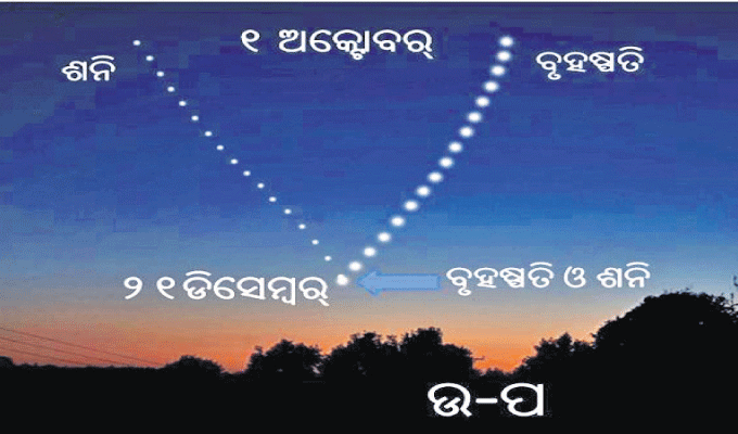 ବର୍ତ୍ତମାନ ଗ୍ରହ ଦୁଇଟି ସୂର୍ଯ୍ୟାସ୍ତ ପରେ ଉତ୍ତର-ପଶ୍ଚିମ ଦିଗ୍ବଳୟର ଅଳ୍ପ ଉପରେ ଖାଲି ଆଖିରେ ଖୁବ୍ ସୁନ୍ଦର ଭାବେ ଦେଖାଯାଉଛି। ଆସନ୍ତା ତିନି ସପ୍ତାହ ଧରି ପ୍ରତିଦିନ ଏହି ଦୁଇଟି ଗ୍ରହ ମଧ୍ୟରେ ଥିବା ଦୂରତା କମିବ ଓ ଖୁବ୍ ପାଖାପାଖି ଦେଖାଯିବେ। ଡିସେମ୍ବର ୨୧ରେ ସୂର୍ଯ୍ୟାସ୍ତର ଏକଘଣ୍ଟା ପରେ ପଶ୍ଚିମ ଦିଗବଳୟ ଉପରେ ଏକତ୍ର ଦେଖାଯିବେ। ସେମାନଙ୍କ ଭିତରେ ଦୂରତା ମାତ୍ର ୦.୧ ଡିଗ୍ରୀ ରହିବ। ଭାରତ ତଥା ଓଡ଼ିଶାର ସବୁ ସ୍ଥାନରୁ ଏହାକୁ ଖାଲି ଆଖିରେ ଦେଖିହେବ। ଛୋଟ ଦୂରବୀକ୍ଷଣରେ ଏକ ସମୟରେ ବୃହସ୍ପତି ଓ ତା’ର ୪ ଉପଗ୍ରହ ଏବଂ ଶନି ଓ ତା’ର ଏକ ଉପଗ୍ରହ ଦେଖିହେବ। ଏଭଳି ବୃହସ୍ପତି ଓ ଶନି ଆମ ଜୀବନକାଳରେ ଥରେ ଏକାଠି ହେବେ, ତେଣୁ ଏପରି ସୁଯୋଗ ହାତଛଡ଼ା କରନ୍ତୁ ନାହିଁ ବୋଲି ଡ. ପଟ୍ଟନାୟକ ପରାମର୍ଶ ଦେଇଛନ୍ତି।