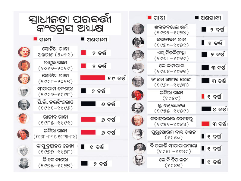ନୂଆଦିଲ୍ଲୀ, ୨୫ା୮: ସମ୍ପ୍ରତି କଂଗ୍ରେସରେ ନେତୃତ୍ୱ ପ୍ରସଙ୍ଗକୁ ନେଇ ସମସ୍ୟା ମୁଣ୍ଡ ଟେକିଛି। ଏହି ପୁରୁଣା ରାଜନୈତିକ ଦଳ ସମ୍ପର୍କରେ ବିଶେଷଜ୍ଞମାନେ କହିଛନ୍ତି ଯେ, ନେହେରୁ ଗାନ୍ଧୀ ପରିବାର ବାହାରୁ ଦଳର ଅଧ୍ୟକ୍ଷ ବଛାଯିବା କାଳ୍ପନିକ ଭାବେ ଠିକ୍। ହେଲେ ଏହା ବାସ୍ତବତା ନୁହେଁ। ଦଳର ଇତିହାସ କହୁଛି, ଦେଶ ସ୍ବାଧୀନ ହେବା ପରଠାରୁ ନେହେରୁ ଗାନ୍ଧୀ ପରିବାରରୁ ୫ ଏବଂ ବାହାରୁ ୧୩ ଜଣ କଂଗ୍ରେସର ଅଧ୍ୟକ୍ଷ ହୋଇଛନ୍ତି। କିନ୍ତୁ ପରିବାର ସଦସ୍ୟମାନେ ବାହାର ବ୍ୟକ୍ତିଙ୍କୁ ଏହି ପଦ ଦେବା ପରେ ବି ସେମାନଙ୍କ ଦ୍ୱାରା ଦଳ ସଞ୍ଚାଳନ କରାଯାଇଥାଏ। ଜବାହରଲାଲ୍ ନେହେରୁ, ଇନ୍ଦିରା ଗାନ୍ଧୀ, ରାଜୀବ ଗାନ୍ଧୀ, ସୋନିଆ ଗାନ୍ଧୀ ଓ ରାହୁଲ ଗାନ୍ଧୀ ସ୍ବାଧୀନତା ପରଠାରୁ ବହୂୁଦିନ ଧରି ଦଳର ନେତୃତ୍ୱ ନେଇଆସିଛନ୍ତି। ସର୍ବାଧିକ କାଳ ଦଳର ଅଧ୍ୟକ୍ଷ ରହିଥିବା ସୋନିଆ ଗାନ୍ଧୀ ସୋମବାର ସିଡବ୍ଲ୍ୟୁସି ବୈଠକରେ ପଦ ଛାଡ଼ିବାକୁ ମନ ବଳାଇଥିଲେ। ଦଳର ପୁରୁଖା ୨୦ରୁ ଅଧିକ ନେତା ସାଙ୍ଗଠନିକ ପୁନର୍ଗଠନ ଓ ଦଳୀୟ ନେତୃତ୍ୱ ପରିବର୍ତ୍ତନ ଲାଗି ଚିଠି ଲେଖିବା ପରେ ଅସନ୍ତୁଷ୍ଟ ସୋନିଆ ହଠାତ୍ ନିଜ ପଦରୁ ଇସ୍ତଫା ଦେବାକୁ ଚାହିଁଥିଲେ। କିନ୍ତୁ ଦଳର ପୂର୍ଣ୍ଣକାଳୀନ ଅଧ୍ୟକ୍ଷ ବଛା ନ ହେବା ପର୍ଯ୍ୟନ୍ତ ପୁଣି ତାଙ୍କୁ ଅନ୍ତରୀଣ ଅଧ୍ୟକ୍ଷ ଦାୟିତ୍ୱରେ ରହିବା ଲାଗି ଅନୁରୋଧ କରାଯାଇଛି।