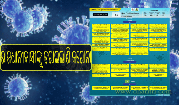ଭୁବନେଶ୍ୱର,୧୪।୭(ବ୍ୟୁରୋ): ରାଜଧାନୀରେ ମଙ୍ଗଳବାର ୫୧ ନୂଆ କରୋନା ପଜିଟିଭ୍ ଚିହ୍ନଟ ହୋଇଛନ୍ତି। ତେବେ ନୂତନ ଆକ୍ରାନ୍ତଙ୍କ ମଧ୍ୟରେ ୩୫ଜଣ କ୍ୱାରାଣ୍ଟାଇନ୍ କେସ୍ ରହିଥିବା ବେଳେ ୧୬ ଲୋକାଲ କେସ୍ ରହିଛି। ଏହାକୁ ମିଶାଇ ଭୁବନେଶ୍ୱରରେ ମୋଟ ସଂକ୍ରମିତଙ୍କ ସଂଖ୍ୟା ୭୬୯କୁ ବୃଦ୍ଧି ପାଇଛି। ସେଥିରୁ ୩୬୧ ସୁସ୍ଥ ହୋଇ ଘରକୁ ଫେରିଥିବା ବେଳେ ୩୯୭ଜଣଙ୍କ ଚିକିତ୍ସା ଜାରି ରହିଛି। ସେହିଭଳି ୧୦ଜଣଙ୍କ ମୃତ୍ୟୁ ଘଟିଛି। ଏହାଛଡ଼ା ୫ଜଣ ସୁସ୍ଥ ହୋଇ ଘରକୁ ଫେରିଥିବା ଭୁବନେଶ୍ୱର ମହାନଗର ନିଗମ(ବିଏମ୍ସି) ପକ୍ଷରୁ ଟୁଇଟ୍ କରି ସୂଚନା ଦିଆଯାଇଛି।