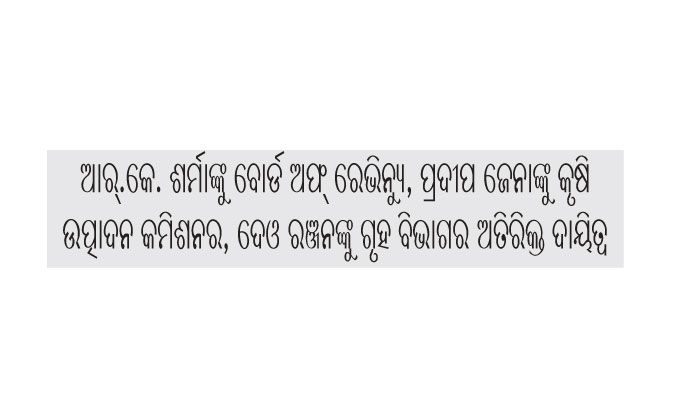 ୧୯୮୭ ବ୍ୟାଚ୍ ଆଇଏଏସ୍ ଅଫିସର ତଥା ଗୋପବନ୍ଧୁ ଏକାଡେମୀ ଡିଜି ଥିବା ଆର୍.କେ. ଶର୍ମାଙ୍କୁ କଟକ ବୋର୍ଡ ଅଫ୍ ରେଭିନ୍ୟୁ ସଦସ୍ୟ ଭାବେ ଅତିରିକ୍ତ ଦାୟିତ୍ୱ ଦିଆଯାଇଥିବା ବେଳେ ୧୯୮୯ ବ୍ୟାଚ୍ ଆଇଏଏସ୍ ଅଫିସର ତଥା ଉନ୍ନୟନ କମିଶନର ପ୍ରଦୀପ ଜେନାଙ୍କୁ କୃଷି ଉତ୍ପାଦନ କମିଶନର, ୧୯୯୩ ବ୍ୟାଚ୍ ଆଇଏଏସ୍ ଅଫିସର ତଥା ଇସ୍ପାତ ଓ ଖଣି ବିଭାଗ ପ୍ରମୁଖ ସଚିବ ଦେଓ ରଞ୍ଜନ କୁମାର ସିଂଙ୍କୁ ଗୃହ ବିଭାଗର ଅତିରିକ୍ତ ଦାୟିତ୍ୱ ଦିଆଯାଇଛି। ସେହିପରି ୧୯୯୧ ବ୍ୟାଚ୍ ଆଇଏଏସ୍ ଅଫିସର ତଥା ରାଜସ୍ବ ଓ ବିପର୍ଯ୍ୟୟ ପରିଚାଳନା ବିଭାଗ ଅତିରିକ୍ତ ମୁଖ୍ୟ ଶାସନ ସଚିବ ସତ୍ୟବ୍ରତ ସାହୁଙ୍କୁ ଓଡ଼ିଆ ଭାଷା, ସାହିତ୍ୟ ଓ ସଂସ୍କୃତି ବିଭାଗ, ୧୯୯୬ ବ୍ୟାଚ୍ ଆଇଏଏସ୍ ଅଫିସର ତଥା ରାଜ୍ୟପାଳଙ୍କ ପ୍ରମୁଖ ସଚିବ ଥିବା ଶାଶ୍ୱତ ମିଶ୍ରଙ୍କୁ ଏମ୍ଏସ୍ଏମ୍ଇ ବିଭାଗ, ୨୦୦୬ ବ୍ୟାଚ୍ ଆଇଏଏସ୍ ଅଫିସର ତଥା ମୁଖ୍ୟମନ୍ତ୍ରୀଙ୍କ ସ୍ବତନ୍ତ୍ର ସଚିବ ରୂପା ରୋଶନ ସାହୁଙ୍କୁ ଏସ୍ସି/ଏସ୍ଟି ଉନ୍ନୟନ ବିଭାଗର ଅତିରିକ୍ତ ଦାୟିତ୍ୱ ଦିଆଯାଇଛି।