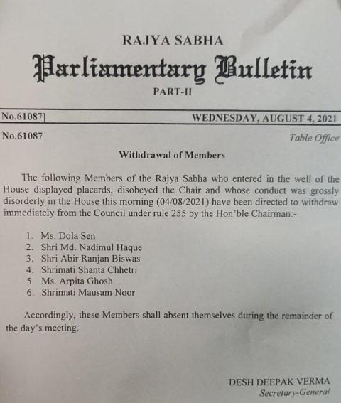 ନିଲମ୍ବିତ ଏମ୍ପିମାନେ ପ୍ଲାକାର୍ଡ ଧରି ଗୃହର ଓ୍ବେଲରେ ପହଞ୍ଚିଥିଲେ। ଏହା ସହିତ ଅଧ୍ୟକ୍ଷଙ୍କ ଆଦେଶକୁ ମଧ୍ୟ ଅବମାନନା କରିଥିଲେ। ବିଶୃଙ୍ଖଳିତ ଆଚରଣ ପ୍ରଦର୍ଶନ ଅଭିଯୋଗ ଲାଗି ଡୋଲା ସେନ, ନାଡିମୁଲ ହକ, ଆବିର ରଞ୍ଜନ ବିଶ୍ୱ, ଶାନ୍ତା ଛତ୍ରୀ, ଅର୍ପିତା ଘୋଷ ଏବଂ ମୌସମ ନୁରଙ୍କୁ ନିଲମ୍ବିିତ କରାଯାଇଛି।