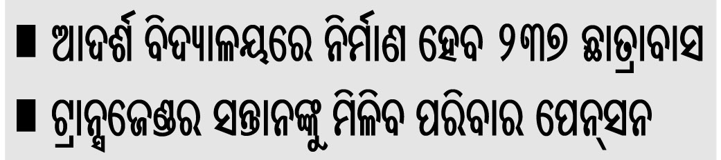 ରାଜ୍ୟ ସରକାର ଓଡ଼ିଶା ଆଦର୍ଶ ବିଦ୍ୟାଳୟରେ ୧୦୦ ଶଯ୍ୟା ବିଶିଷ୍ଟ ୨୩୭ଟି ଛାତ୍ରାବାସ (ବାଳକ) ନିର୍ମାଣ କରିବାକୁ ନିଷ୍ପତ୍ତି ନେଇଛନ୍ତି। ଏଗୁଡ଼ିକର ନିର୍ମାଣ ପାଇଁ ୧୦୦୦.୧୪ କୋଟି ଟଙ୍କା ବ୍ୟୟ ଅଟକଳ କରାଯାଇଛି। ପ୍ରତ୍ୟେକ ଛାତ୍ରାବାସ ପାଇଁ ୪.୨୨ କୋଟି ଟଙ୍କା ବ୍ୟୟବରାଦ କରାଯାଇଛି। ଛାତ୍ରାବାସଗୁଡିକୁ ୩ ମହଲା ବିଶିଷ୍ଟ ହେବ ଏବଂ ନିର୍ମାଣ କାର୍ଯ୍ୟ ୧ ବର୍ଷ ମଧ୍ୟରେ ଶେଷ ହେବ। ସ୍କୁଲ ଓ ଗଣଶିକ୍ଷା ବିଭାଗ ପକ୍ଷରୁ ଦିଆଯାଇଥିବା ଏହି ପ୍ରସ୍ତାବକୁ କ୍ୟାବିନେଟ ଅନୁମୋଦନ କରିଛି।