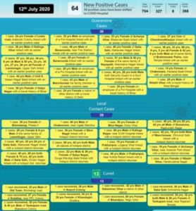 ଭୁବନେଶ୍ୱର,୧୨।୭(ବ୍ୟୁରୋ)-ଆଜି ପୁଣି ରାଜଧାନୀ ଭୁବନେଶ୍ୱରରୁ ୬୪ କରୋନା ପଜିଟିଭ ଚିହ୍ନଟ ହୋଇଛନ୍ତି। ସେମାନଙ୍କ ମଧ୍ୟରୁ ୩୬ ଜଣ କ୍ୱାରେଣ୍ଟାଇନ ସେଣ୍ଟରରୁ ଚିହ୍ନଟ ହୋଇଥିବା ବେଳେ ୨୮ ଜଣ ସ୍ଥାନୀୟ ସଂକ୍ରମିତ ଅଛନ୍ତି। ସେହିପରି ୧୩ ଜଣ ସୁସ୍ଥ ହୋଇ ଘରକୁ ଫେରିଛନ୍ତି। ଏନେଇ ଭୁବନେଶ୍ୱର ମହାନଗର ନିଗମ(ବିଏମସି)ପକ୍ଷରୁ ଟୁଇଟ କରି ସୂଚନା ଦିଆଯାଇଛି।