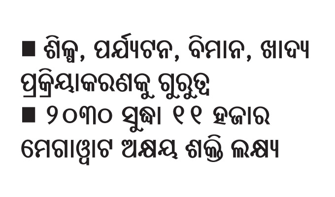 ଓଡ଼ିଶା ଅକ୍ଷୟ ଶକ୍ତି ନୀତି-୨୦୨୨ କ୍ୟାବିନେଟର ଅନୁମୋଦନ ଲାଭ କରିଛି । ଏହି ନୀତି ଜରିଆରେ ୨୦୩୦ ସୁଦ୍ଧା ରାଜ୍ୟରେ ବିଭିନ୍ନ ଉତ୍ସରୁ ପ୍ରାୟ ୧୧ ହଜାର ମେଗାୱାଟ ଅକ୍ଷୟ ଶକ୍ତି କ୍ଷମତା ହାସଲ କରିବାକୁ ଲକ୍ଷ୍ୟ ରଖାଯାଇଛି।