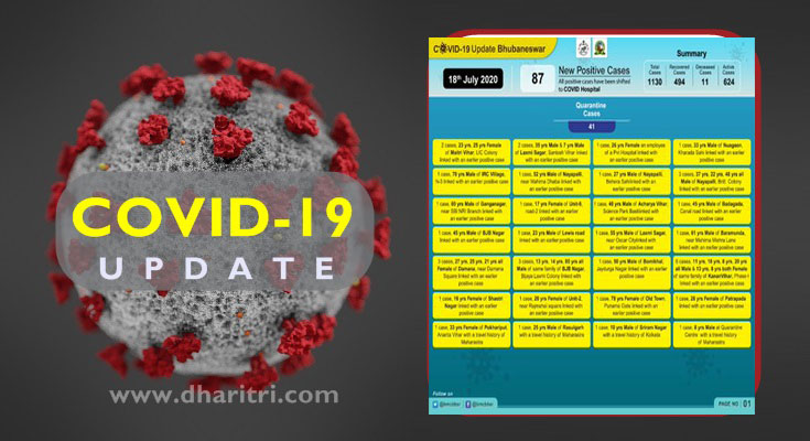ଭୁବନେଶ୍ୱର,୧୮।୭(ବ୍ୟୁରୋ)- ଶନିବାର ଭୁବନେଶ୍ୱରରେ ଆଉ ୮୭ କରୋନା ପଜିଟିଭ୍ ଚିହ୍ନଟ ହୋଇଛନ୍ତି। କ୍ୱାରାଣ୍ଟାଇନରୁ ୪୧ ଜଣ ଚିହ୍ନଟ ହୋଇଥିବାବେଳେ ଲୋକାଲ କେସ ୪ହାଇ ନୟାପଲ୍ଲୀ ତ୍ରିନାଥ ନଗର ବସ୍ତିରୁ ୪ ଲୋକାଲ କଣ୍ଟାକ୍ଟ କେସ, ଗୌତମ ନଗର ହରିହର ଏନକ୍ଲେଭରୁ ୩ ଜଣ, ଗଙ୍ଗନଗର ପିଚୁ ପଡିଆ ବସ୍ତିରୁ ୨, ଶୈଳଶ୍ରୀ ବିହାରରୁ ୨, ଦୂରଦର୍ଶନ କେନ୍ଦ୍ର ପାଖରେ ଥିବା ଏକ ଘରୋଇ ହସ୍ପିଟାଲ ୨ କର୍ମଚାରୀ, କାନନବିହାର ଫେଜ ୧ରେ ଗୋଟିଏ ପରିବାରରୁ ୬ ପଜିଟିଭ ଚିହ୍ନଟ ହୋଇଛନ୍ତି। ସେହିପରି ନୟାପଲ୍ଲୀ ବ୍ରିଟ କଲୋନୀରୁ ୩, ବିଜେବି ନଗରର, ଡମଣାରୁ ୩, ଲକ୍ଷ୍ମୀସାଗରରୁ ୨, ମୈତ୍ରୀ ବିହାରରୁ ୨ ଜଣ କରୋନା ଆକ୍ରାନ୍ତ ଚିହ୍ନଟ ହୋଇଛନ୍ତି। ଏହାକୁ ମିଶାଇ ଭୁବନେଶ୍ୱରରେ କରୋନା ଆକ୍ରାନ୍ତଙ୍କ ସଂଖ୍ୟା ୧୧୩୦କୁ ବୃଦ୍ଧି ଘଟିଛି। ଏମାନଙ୍କ ମଧ୍ୟରୁ ୪୯୪ ଜଣ ସୁସ୍ଥ ହୋଇଥିଲାବେଳେ ୧୧ ଜଣଙ୍କର ମୃତ୍ୟୁ ଘଟିଛି। ବର୍ତ୍ତମାନ ୬୨୪ ଆକ୍ଟିଭ କେସ ରହିଛି। ଏ ନେଇ ବିଏମସି ପକ୍ଷରୁ ଟୁଇଟ କରି ସୂଚନା ଦିଆଯାଇଛି।