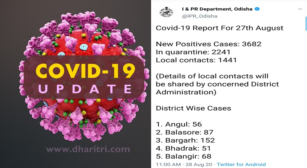 ଭୁବନେଶ୍ୱର,୨୮ା୮(ବ୍ୟୁରୋ): ଶୁକ୍ରବାର ୩୦ ଜିଲାରୁ ୩,୬୮୨ ନୂଆ ପଜିଟିଭ୍ ଚିହ୍ନଟ ହୋଇଛନ୍ତି। ଏହାକୁ ମିଶାଇ ରାଜ୍ୟରେ ମୋଟ୍ ଆକ୍ରାନ୍ତଙ୍କ ସଂଖ୍ୟା ୯୪,୬୬୮ରେ ପହଞ୍ଚିଥିବା ରାଜ୍ୟ ସୂଚନା ଓ ଲୋକ ସମ୍ପର୍କ ବିଭାଗ ସୂଚନା ଦେଇଛି। ଏଥିମଧ୍ୟରୁ କ୍ୱାରାଣ୍ଟାଇନ୍ରୁ ୨୨୪୧ ଜଣ ଚିହ୍ନଟ ହୋଇଥିବା ବେଳେ ୧୪୪୧ ଜଣ ସ୍ଥାନୀୟ ସଂକ୍ରମିତ ଅଟନ୍ତି।