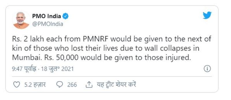 ସେହିପରି ଆହତଙ୍କୁ ୫୦ ହଜାର ଟଙ୍କା ପ୍ରଦାନ କରାଯିବ ବୋଲି ପ୍ରଧାନମନ୍ତ୍ରୀଙ୍କ କାର୍ଯ୍ୟାଳୟ ପକ୍ଷରୁ ଟୁଇଟ୍ କରି ସୂଚନା ପ୍ରଦାନ କରାଯାଇଛି।