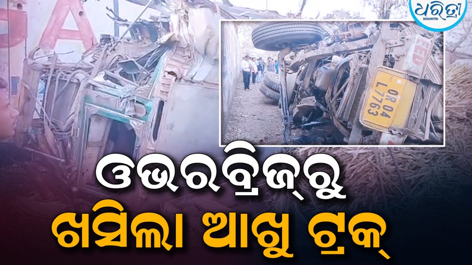 ଓଭରବ୍ରିଜ୍ ଉପରୁ ଖସିଲା ଆଖୁ ବୋଝେଇ ଟ୍ରକ୍, ଗାଡ଼ି ତଳେ କେହି ଫସିରହିଥିବା ସନ୍ଦେହ