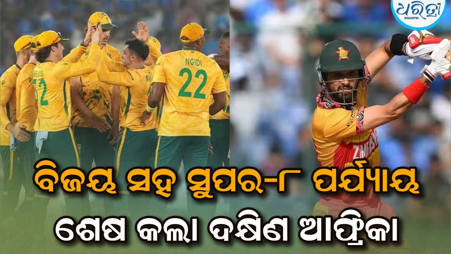 ନୂଆଦିଲ୍ଲୀ,୧।୩: ଟି୨୦ ବିଶ୍ୱକପ୍ରେ ରବିବାର ଖେଳାଯାଇଥିବା ସୁପର-୮ ମ୍ୟାଚ୍ରେ ଦକ୍ଷିଣ ଆଫ୍ରିକା ୫ ଉଇକେଟରେ ଜିମ୍ବାଓ୍ବେକୁ ପରାସ୍ତ କରିଛି। ଜିମ୍ବାଓ୍ବେ ଦ୍ୱାରା ପ୍ରଦତ୍ତ ୧୫୪ ରନର ଟାର୍ଗେଟକୁ ଦ. ଆଫ୍ରିକା ୧୭.୫ ଓଭରରେ ୫…