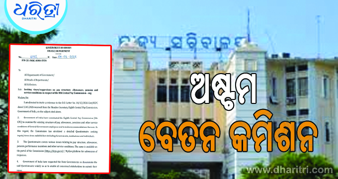 ଭୁବନେଶ୍ୱର,୯।୩: ଅଷ୍ଟମ ବେତନ କମିଶନ ପାଇଁ ଅର୍ଥ ବିଭାଗ ପକ୍ଷରୁ ଚିଠି। ଚିଠିରେ ସମସ୍ତ ଜିଲାପାଳ ଏବଂ ସରକାରୀ ବିଭାଗ ମୁଖ୍ୟଙ୍କଠାରୁ ମତାମତ ଲୋଡ଼ିଲେ ରାଜ୍ୟ ସରକାର। ଦରମା, ଭତ୍ତା, ପେନସନ ବୃଦ୍ଧି ସମ୍ପର୍କରେ…