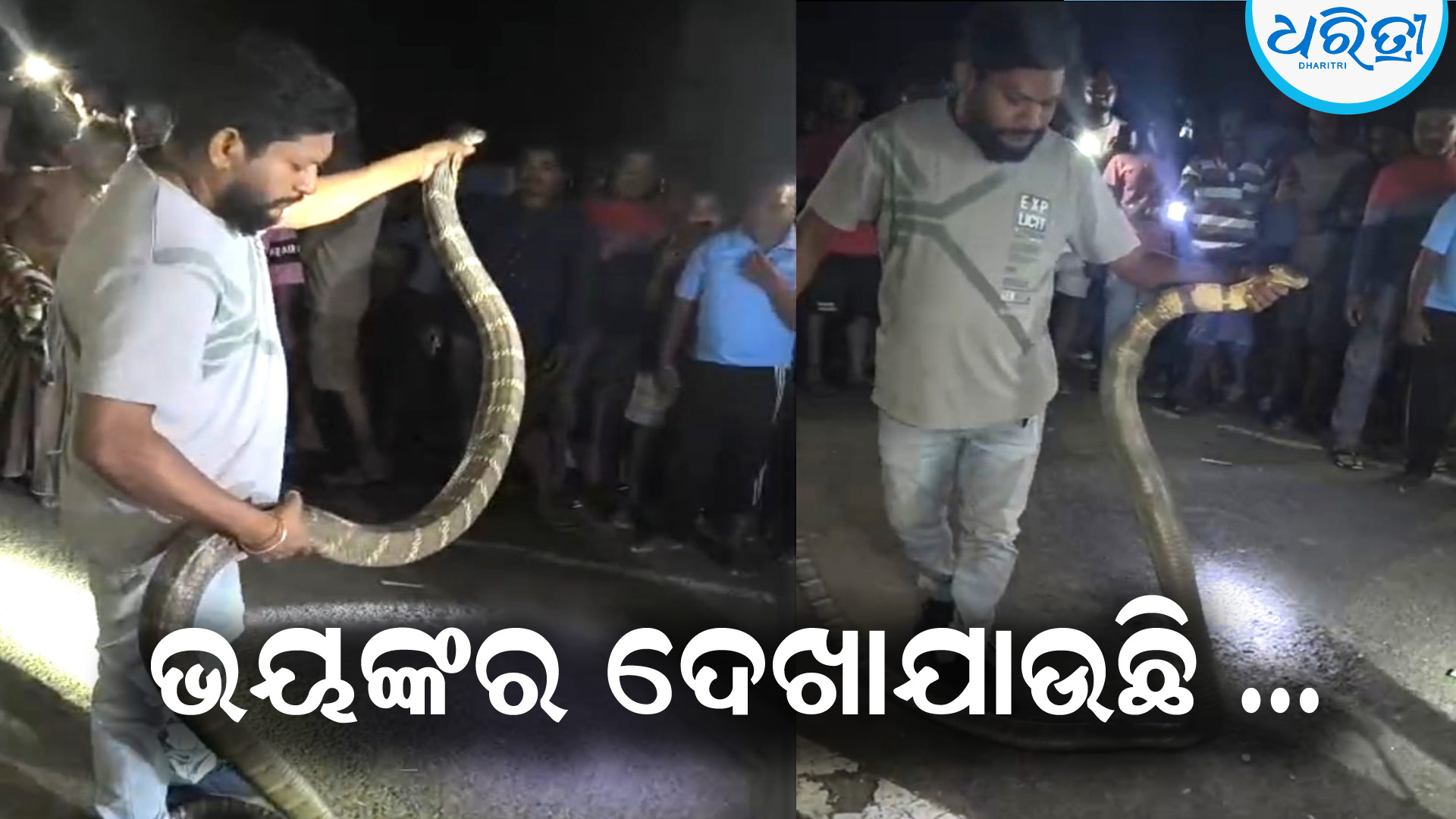 ଦିଗପହଣ୍ଡି,୭।୪(ଅଶେଷ ନାଥ ମିଶ୍ର): ଗଞ୍ଜାମ ଜିଲା ଦିଗପହଣ୍ଡି ବ୍ଲକ କଇଠଖଣ୍ଡି ପଞ୍ଚାୟତ ପେଣ୍ଡୁରାବାଡ଼ି ଗାଁରୁ ୧୨ ଫୁଟ ଲମ୍ବର ଏକ ଅହିରାଜ (କିଙ୍ଗକୋବ୍ରା) ସାପକୁ ବନବିଭାଗ କର୍ମଚାରୀ ବୃନ୍ଦ ଉଦ୍ଧାର କରିଛନ୍ତି। ଅପରାହ୍ନରେ କାଳ ବୈଶାଖୀ ପ୍ରଭାବରେ ବଜ୍ରପାତ ସାଙ୍ଗକୁ ଭୀଷଣ ବର୍ଷା ଯୋଗୁ ବିଦ୍ୟୁତ ସରବରାହ ବିଚ୍ଛିନ୍ନ ହୋଇଯାଇଥିଲା। ରାତିରେ ନୀଳାଞ୍ଚଳ ସାହୁଙ୍କ ଜଳଖିଆ ହୋଟେଲ ନିକଟ ଜାଳେଣି କାଠ ଗଦାରେ କିଛି ଗ୍ରାମବାସୀ ସାପକୁ ଦେଖିବା ପରେ ଭୟଭୀତ ହୋଇଯାଇଥିଲେ। ଖବର ପ୍ରଚାରିତ ହେବାପରେ ସାପ ଦେଖିବାକୁ ଘଟଣାସ୍ଥଳରେ ଲୋକଙ୍କ ଭିଡ଼ ହୋଇଥିଲା। ଏ ନେଇ ଦିଗପହଣ୍ଡି ବନବିଭାଗ କାର୍ଯ୍ୟାଳୟକୁ ସୂଚନା ଦିଆଯିବା ପରେ ରେଞ୍ଜର ଦିବ୍ୟରଞ୍ଜନ ସାହୁ, ଫରେଷ୍ଟର ସନ୍ତୋଷ ବିଷୋୟୀ ରତ୍ନ ସ୍ନେକ ହେଲ୍ପଲାଇନ ସଦସ୍ୟଙ୍କୁ ଜଣାଇଥିଲେ।