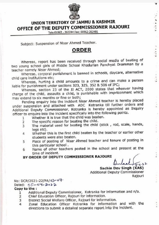 ଜମ୍ମୁ,୭ ।୪: ଜମ୍ମୁ-କଶ୍ମୀର ଖଦୁରିୟାନ ପଞ୍ଚାୟତ ଦ୍ରାମନ ମିଡିଲ ସ୍କୁଲରେ ଶିକ୍ଷକଙ୍କୁ ପିଟିବଳର ଅଭିଯୋଗରେ ୨ ଛାତ୍ରୀଙ୍କ ନାଁରେ ମାମଲା ରୁଜୁ କରାଯାଇଛି । ଶିକ୍ଷକ ଜଣକ ହେଲେ ନିସାର ଅହମ୍ମଦ । ତାଙ୍କୁ କାର୍ଯ୍ୟରୁ ନିଲମ୍ବନ କରାଯାଇଛି । ସୂଚନାଯୋଗ୍ୟ, ନବରାତ୍ରୀ ଚାଲିଥିବାରୁ ଦୁଇଜଣ ଛାତ୍ରୀ ମଥାରେ ତିଳକ ଲଗାଇ ସ୍କୁଲ ଯାଇଥିଲେ । ହେଲେ ଏହାକୁ ବିରୋଧ କରି ଶିକ୍ଷକ ନାସିର ଅହମ୍ମଦ ସେମାନଙ୍କୁ ମାଡ ମାରିଥିବା ଅଭିଯୋଗ ହୋଇଥିଲା । ଏବେ ମିଳିଥିବା ସୂଚନାରୁ ଜଣାପଡିଛି କି ଉକ୍ତ ଘଟଣାର ଯାଞ୍ଚ ନିର୍ଦ୍ଦେଶ ଦିଆଯିବା ସହ ଶିକ୍ଷକଙ୍କୁ ମାଡ ମାରିବା ଅଭିଯୋଗରେ ୨ ଛାତ୍ରୀଙ୍କ ନାଁରେ ମାମଲା ରୁଜୁ କରାଯାଇଛି ।