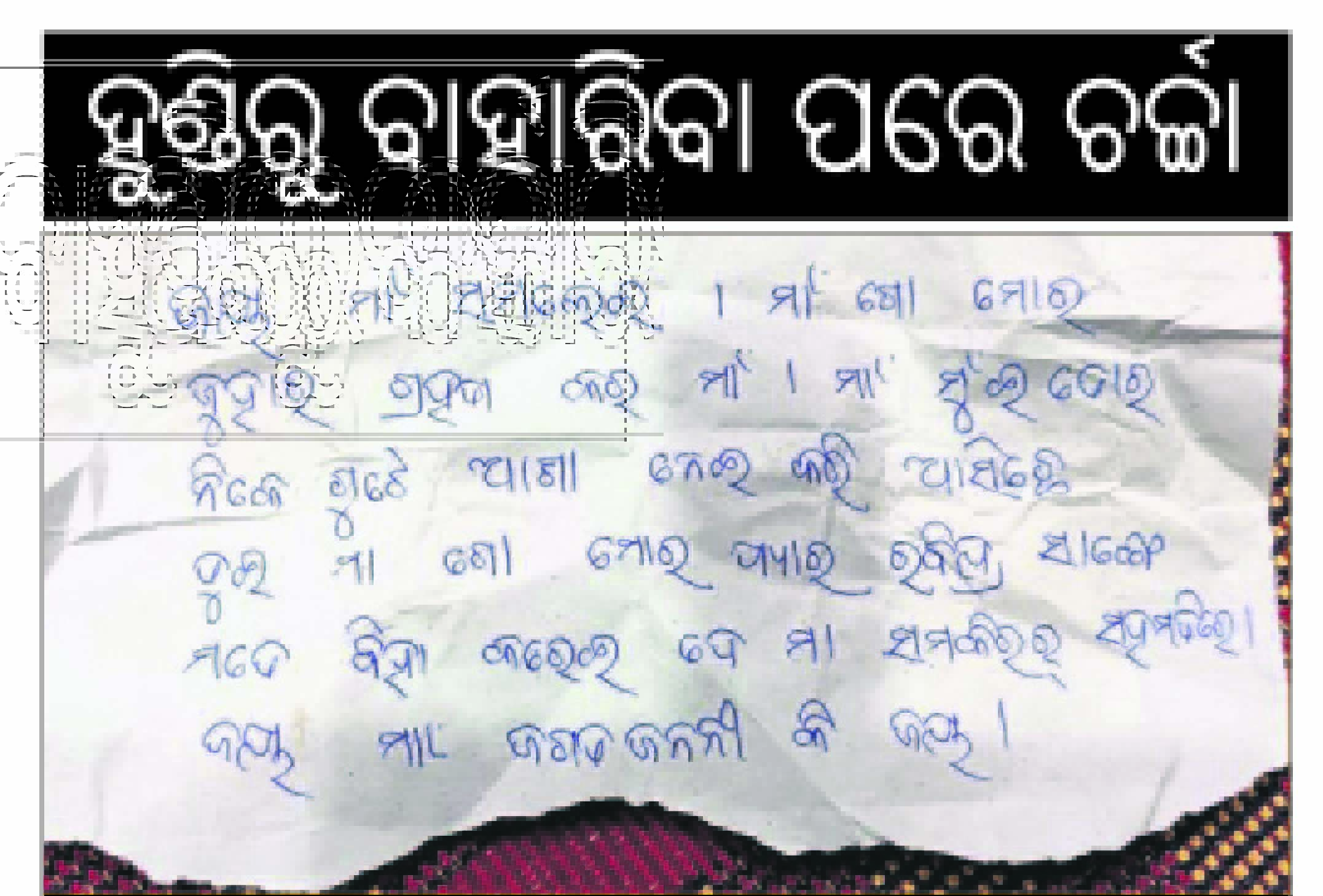 ସମ୍ବଲୁପୁର,୨୭ା୯(ବ୍ୟୁରୋ):ନିଜ ପ୍ରେମକୁ ପାଇବା ପାଇଁ ବର୍ତ୍ତମାନ ସମୟରେ ଯୁବତୀଯୁବକ ଭିନ୍ନ ଭିନ୍ନ ପନ୍ଥା ଅବଲମ୍ବନ କରୁଛନ୍ତି। କେହିକେହି ଠାକୁରଙ୍କ ନିକଟରେ ଗୁହାରି ପଡ଼ୁଛନ୍ତି। ନିଜର ମନସ୍କାମନା ପୂର୍ଣ୍ଣ ପାଇଁ ମାନସିକ ମଧ୍ୟ ରଖୁଛନ୍ତି। ହେଲେ ଏବେ ଜଣେ ଯୁବତୀ ମନ୍ଦିର ହୁଣ୍ଡି ବାକ୍ସରେ ଏକ ଚିଠି ପକାଇ ନିଜର ପ୍ରେମ ବିବାହକୁ ସାକାର କରାଇଦେବାକୁ ମା’ସମଲେଇଙ୍କୁ ନିବେଦନ କରିଥିବା ଜାଣିବାକୁ ମିଳିଛି। ଏହି ଘଟଣା ଏବେ ଜିଲାରେ ଚର୍ଚ୍ଚାର କେନ୍ଦ୍ରବିନ୍ଦୁ ପାଲଟିଛି।