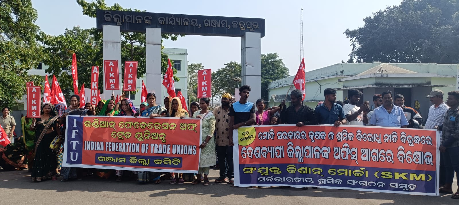 ଛତ୍ରପୁର,୨୬।୧୧(ଦିଲ୍ଲୀପ ସାମଲ): ମୋଦି ସରକାରଙ୍କ କୃଷକ ଓ ଶ୍ରମିକ ନୀତି ବିରୋଧରେ ଜିଲାପାଳଙ୍କ କାର୍ଯ୍ୟାଳୟ ସମ୍ମୁଖରେ ବିକ୍ଷୋଭ ପ୍ରଦର୍ଶନ କରିବା ନିମନ୍ତେ ସଂଯୁକ୍ତ କିଷାନ ମୋର୍ଚ୍ଚା ଓ କେନ୍ଦ୍ରୀୟ ଶ୍ରମିକ ସଂଗଠନମାନଙ୍କ ପକ୍ଷରୁ ଡାକରା ଦିଆଯାଇଛି। ଏହି ପରିପ୍ରେକ୍ଷୀରେ ସଂଯୁକ୍ତ କିଷାନ ମୋର୍ଚ୍ଚା ଗଞ୍ଜାମ ଜିଲା କମିଟି ଏବଂ ବିଭିନ୍ନ ଶ୍ରମିକ ଓ କୃଷକ ସଂଗଠନ ପକ୍ଷରୁ ଶହ ଶହ ଶ୍ରମିକ ଓ କୃଷକମାନେ କେନ୍ଦ୍ର ସରକାରଙ୍କ ଶ୍ରମିକ ଓ କୃଷକ ବିରୋଧୀ ନୀତି ପ୍ରତିବାଦରେ ଗଞ୍ଜାମ ଜିଲାପାଳଙ୍କ କାର୍ଯ୍ୟାଳୟ ସମ୍ମୁଖରେ ବିକ୍ଷୋଭ ପ୍ରଦର୍ଶନ କରିବା ସହିତ ରାଷ୍ଟ୍ରପତିଙ୍କ ଉଦ୍ଦେଶ୍ୟରେ ଏକ ସମ୍ବଳିତ ସ୍ମାରକ ପତ୍ର ପ୍ରଦାନ କରାଯାଇଛି। ୪ଟି ଶ୍ରମ କୋଡ଼ର ପ୍ରତ୍ୟାହାର ଏବଂ ଅସଂଗଠିତ କ୍ଷେତ୍ରର ସବୁ ଶ୍ରମିକଙ୍କୁ ପେନସନ ସମେତ ସାମଗ୍ରୀକୁ ସାମାଜିକ ସୁରକ୍ଷା ପ୍ରଦାନ କରିବା, ଶିଳ୍ପାୟନ ଓ ଖଣି ଖନନ ଫଳରେ ଚାଷ ଜମି ଓ ଜଙ୍ଗଲର ହେଉଥିବା ଅବକ୍ଷୟ ତଥା ପରିବେଶ ପ୍ରଦୂଷଣକୁ ରୋକିବାକୁ ଦୃଢ ପଦକ୍ଷେପ ନିଆଯାଉ। ସବୁ ଚାଷ ଜମିକୁ ଜଳ ସେଚନର ସୁବିଧା ନିମନ୍ତେ ଜଳ ସେଚନ ମିଶନ ଗଠନ କରିବା ସମେତ ୨୦ଦଫା ଦାବି ସମ୍ପର୍କରେ ଉକ୍ତ ସ୍ମାରକ ପତ୍ରରେ ଉଲ୍ଲେଖ କରାଯାଇଛି।