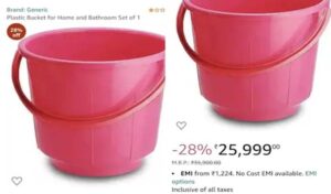 ବାସ୍ତବରେ ଏହି ବାଲ୍ଟି ସାଧାରଣ ବାଲ୍ଟି ପରି ଦେଖାଯାଉଛି। ଯାହା ବଜାରରେ ୨୫୦ରୁ ୩୦୦ ଟଙ୍କା ମୂଲ୍ୟରେ ମିଳିଥାଏ। କିନ୍ତୁ ଆମାଜନରେ ଏହି ବାଲ୍ଟିର ଦାମ୍ ୨୫,୯୯୯ ଟଙ୍କା। ଲୋକେ ଏହି ଦାମ୍କୁ ସହଜରେ ଗ୍ରହଣ କରିପାରୁନାହାନ୍ତି। ଆମାଜନ କାହିଁକି ଏକ ସାଧାରଣ ଲାଲ ବାଲ୍ଟିକୁ ୨୬୦୦୦ ବିକ୍ରି କରୁଛି?