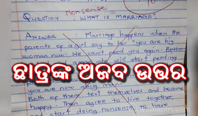 ବିବାହ ସମ୍ବନ୍ଧରେ ଛାତ୍ରଙ୍କ ଏହି ଉତ୍ତର ସିଟ୍ ଲୋକଙ୍କ ଦୃଷ୍ଟି ଆକର୍ଷଣ କରୁଛି। ଯଦିଓ ଛାତ୍ର ଏହି ଉତ୍ତରରେ ୧୦ରୁ ୦ ମାର୍କ ପାଇଛନ୍ତି। ଶିକ୍ଷକ ତାଙ୍କ ମନ୍ତବ୍ୟରେ ଲେଖିଛନ୍ତି – ନନ୍ସେନ୍ସ। ଛାତ୍ର ଲେଖିଛନ୍ତି, ବିବାହ ହୁଏ ଯେତେବେଳେ ଝିଅର ମା’ ତାଙ୍କୁ କୁହନ୍ତି ତୁମେ ବର୍ତ୍ତମାନ ବଡ଼ ହୋଇଛ। ଆମେ ତୁମକୁ ଆଉ ଖାଇବାକୁ ଦେଇ ପାରିବୁ ନାହିଁ। ଭଲରେ ଯାଇ ଜଣେ ପୁରୁଷ ଖୋଜ, ଯିଏ ତୁମକୁ ଖାଇବାକୁ ଦେବ। ସେ ଏପରି ଜଣେ ବ୍ୟକ୍ତିଙ୍କୁ ଭେଟିଥାଏ ଯାହାର ମାତାପିତା ଚାହାନ୍ତି, ସେ ବିବାହ କରନ୍ତୁ। ଲୋକମାନେ ଏହି ଉତ୍ତରକୁ ବହୁତ ଉପଭୋଗ କରିଛନ୍ତି ଏବଂ ଏହାକୁ ସଠିକ୍ ପରିଭାଷା ବୋଲି କହିଛନ୍ତି।
