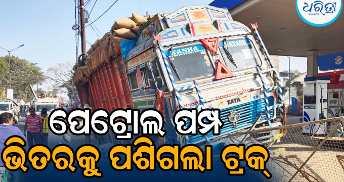 ପେଟ୍ରୋଲ ପମ୍ପ କ୍ୟାମ୍ପସ ଭିତରକୁ ମାଡ଼ିଗଲା ଧାନ ବୋଝେଇ ଟ୍ରକ୍‌, ବିଦ୍ୟୁତ୍‌ ଖୁଣ୍ଟରେ ପିଟି ହୋଇ…