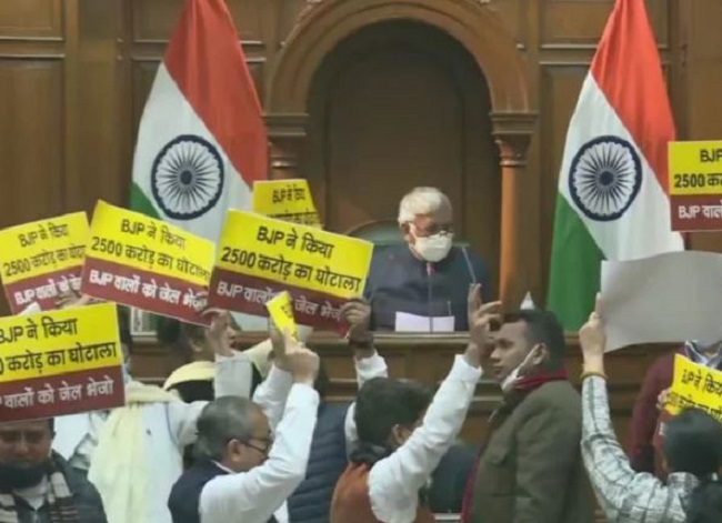 ନୂଆଦିଲ୍ଲୀ,୧୮ ।୧୨: ଆମ ଆଦମୀ ପାର୍ଟି(ଏଏପି) ବିଧାନସଭାର ବିଶେଷ ଅଧିବେଶନକୁ ଶୁକ୍ରବାର ପର୍ଯ୍ୟନ୍ତ ବଢାଇ ଦେଇଛି । ଦ୍ୱିତୀୟ ଦିନ ବି ଏହାର ଆରମ୍ଭ ପାଟିତୁଣ୍ଡରୁ ଆରମ୍ଭ ହୋଇଛି । ଦ୍ୱିତୀୟ ଦିନର କାର୍ଯ୍ୟ ଆରମ୍ଭ ହେବା ପରେ ପରେ ଆମ ଆଦମୀ ପାର୍ଟି(ଏଏପି)ବିଧାୟକମାନେ ଭାରତୀୟ ଜନତା ପାର୍ଟି(ଭାଜପା) ଉପରେ ନଗର ନିଗମରେ ୨,୫୦୦କୋଟି କଥିତ ଘୋଟାଲା ଅଭିଯୋଗ କରି ଗୃହରେ ବ୍ୟାନର ଦେଖାଇଥିଲେ । ଉକ୍ତ ବ୍ୟାନରରେ ଲେଖାଯାଥିଲା ଭାଜପା ୨,୫୦୦କୋଟି ଘୋଟାଲା ଭାଜପା ନେତାଙ୍କୁ ଜେଲ ପଠାଯାଉ ।