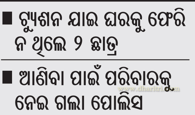 ବାରଙ୍ଗ(ଲିଙ୍ଗରାଜ ରାଉତ)/ଟିଟିଲାଗଡ଼,୬।୭(ଶରତ ମିଶ୍ର)ରାଜଧାନୀ ଉପକଣ୍ଠ ଚନ୍ଦକା ଥାନା ଅଧୀନ ସୁନ୍ଦରପୁର ଅଞ୍ଚଳରେ ଥିବା ଏକ ଘରୋଇ ସ୍କୁଲର ଦଶମ ଶ୍ରେଣୀର ୨ଜଣ ଛାତ୍ର ନିଖୋଜ ହୋଇଥିବା ନେଇ ମଙ୍ଗଳବାର ଅଭିଯୋଗ ହୋଇଥିଲା। ଏ ନେଇ ପୋଲିସ ତଦନ୍ତ କରୁଥିବାବେଳେ ବୁଧବାର ଛାତ୍ରଦ୍ୱୟ ଅପହରଣର ଶିକାର ହୋଇଥିବା ନେଇ ନିଜ ଆଡୁ ପରିବାର ଲୋକଙ୍କୁ ଜଣାଇବା ସହ ଟିଟିଲାଗଡ଼ରେ ଥିବା ନେଇ କହିଛନ୍ତି। ପିଲା ୨ଜଣଙ୍କ ପତ୍ତା ଜଣାପଡ଼ିବା ପରେ ପରିବାର ଲୋକେ ପୋଲିସକୁ କହିଥିଲେ। ପରେ ସେମାନଙ୍କୁ ଆଣିବା ପାଇଁ ପୋଲିସ ସହ ପରିବାର ଲୋକେ ଟିଟିଲାଗଡ଼ ଗସ୍ତ କରିଛନ୍ତି।