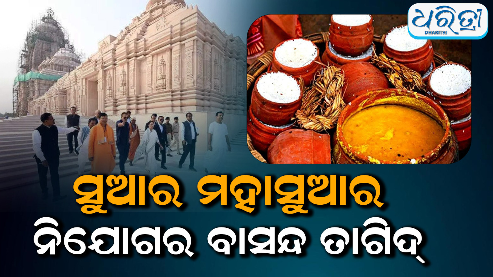 ପୁରୀ,୨୪।୪: ପଶ୍ଚିମବଙ୍ଗ ସରକାରଙ୍କ ଦ୍ୱାରା ଦିଘାରେ ନିର୍ମାଣ ହୋଇଥିବା ଜଗନ୍ନାଥ ମନ୍ଦିର ଆସନ୍ତା 30 ତାରିଖ ଅକ୍ଷୟ ତୃତୀୟାରେ ଉଦଘାଟନ ହେବ। ଏହି କାର୍ଯ୍ୟକ୍ରମରେ ପୁରୀ ଶ୍ରୀମନ୍ଦିର ସୁଆର ମହାସୁଆର ନିଯୋଗ ପକ୍ଷରୁ ଅବଢ଼ା ଓ ଶୁଖିଲା ମହାପ୍ରସାଦ ପ୍ରସ୍ତୁତକାରୀଙ୍କ ଏକ ନିର୍ଦ୍ଦେଶ ଜାରି ହୋଇଛି।