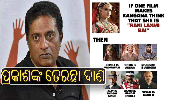 ଟୁଇଟ୍ରେ ଏକପ୍ରକାର କଙ୍ଗନାଙ୍କ ମଜା ଉଡାଇଛନ୍ତି ପ୍ରକାଶ। ଏକ ମେମେ ଶେୟାର କରି ସେ କହିଛନ୍ତି, କଙ୍ଗନା ଯଦି ଗୋଟିଏ ଫିଲ୍ମ କରି ନିଜକୁ ରାଣୀ ଲକ୍ଷ୍ମାବାଇ ଭାବୁଛନ୍ତି ତେବେ ସେହି ହିସାବରେ ଦୀପିକା ପାଦ୍ୟୁକୋନ ପଦ୍ମାବତୀ, ହ୍ରିତିକ ରୋଶନ ଆକବର, ଶାହରୁଖ ଖାନ ଅଶୋକ, ଅଜୟ ଦେବଗନ ଭଗତ ସିଂହ, ଆମିର ଖାନ ମଙ୍ଗଲ ପାଣ୍ଡେ, ବିବେକ ଓବରୟ ମୋଦି ଜୀ ହେବା ଦରକାର। ପ୍ରକାଶଙ୍କ ଏହି ଟୁଇଟ୍ ଏବେ ଭାଇରାଲ ହେଉଛି। ଲୋକମାନେ ଏଥିରେ ଭଳିକି ଭଳି ପ୍ରତିକ୍ରିୟା ଦେଉଛନ୍ତି। ଅନେକ ଲୋକ କଙ୍ଗାନାଙ୍କୁ ସମର୍ଥନ କରୁଥିବା ଦେଖାଯାଉଛି। ତେବେ ପୂର୍ବରୁ କଙ୍ଗନାଙ୍କ ଓ୍ବାଇ କାଟାଗୋରୀ ସୁରକ୍ଷା ବ୍ୟବସ୍ଥାକୁ ନେଇ ପ୍ରକାଶ ପ୍ରତିକ୍ରିୟା ରଖିଥିଲେ। କଙ୍ଗନା ଓ ଚାଲି ଚାଲି ଯାଉଥିବା ପ୍ରବାସୀ ଶ୍ରମିକଙ୍କ ଫଟୋ ଶେୟାର କରି ‘ଏହା ନ୍ୟୁ ଇଣ୍ଡିଆ’ ବୋଲି ସେ ଲେଖିଥିଲେ।