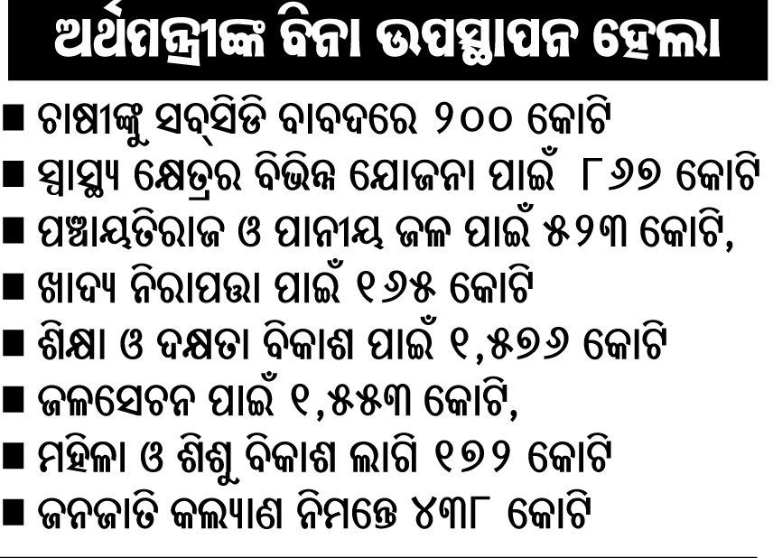 ବଜେଟରେ ପ୍ରଶାସନିକ ବ୍ୟୟ ବାବଦକୁ ୪,୯୩୪ କୋଟି ଟଙ୍କା ବ୍ୟୟବରାଦ କରାଯାଇଥିବା ବେଳେ କାର୍ଯ୍ୟକ୍ରମ ବ୍ୟୟ ବାବଦକୁ ୯,୨୦୦ କୋଟି ଟଙ୍କା, ବିପର୍ଯ୍ୟୟ ପରିଚାଳନା ପାଇଁ ୨,୬୧୦ କୋଟି ଏବଂ ସ୍ଥାନୀୟ ନିକାୟ ସଂସ୍ଥାକୁ ପାଣ୍ଠି ହସ୍ତାନ୍ତର ବାବଦକୁ ୫୬ କୋଟି ଟଙ୍କା ଅନ୍ତର୍ଭୁକ୍ତ କରାଯାଇଛି। କାର୍ଯ୍ୟକ୍ରମ ବ୍ୟୟବରାଦରେ ମୋଟ ୯୨୦୦ କୋଟି ଟଙ୍କା ମଧ୍ୟରୁ ୭୧୩୪ କୋଟି ଟଙ୍କାକୁ ଅତିରିକ୍ତ ରାଜସ୍ବ ତଥା ବିଭିନ୍ନ ବିଭାଗର ଅର୍ଥ ସମର୍ପଣରୁ ଭରଣା କରାଯିବ ଏବଂ ବାକି ୨୦୬୬ କୋଟି ଟଙ୍କା ସହବନ୍ଧିତ ସମ୍ବଳ ସୂତ୍ରରୁ ମିଳିବ । ୯୨୦୦ କୋଟି ଟଙ୍କାର କାର୍ଯ୍ୟକ୍ରମ ବ୍ୟୟବରାଦ ମଧ୍ୟରୁ ରାଜ୍ୟସ୍ତରୀୟ ଯୋଜନା ବାବଦକୁ ୬,୧୬୭ କୋଟି ଟଙ୍କା, କେନ୍ଦ୍ରୀୟ ପ୍ରବର୍ତ୍ତିତ ଯୋଜନା ବାବଦକୁ ୨,୮୯୧ କୋଟି ଏବଂ କେନ୍ଦ୍ରୀୟ ଯୋଜନା ପାଇଁ ୧୪୧ କୋଟି ଟଙ୍କା ବ୍ୟୟବରାଦ କରାଯାଇଛି। ସ୍ବାସ୍ଥ୍ୟ କ୍ଷେତ୍ରର ବିଭିନ୍ନ ଯୋଜନା ପାଇଁ ୮୬୭ କୋଟି ଟଙ୍କା, ପଞ୍ଚାୟତିରାଜ ଓ ପାନୀୟ ଜଳ ବିଭାଗ ପାଇଁ ୫୨୩ କୋଟି, ଖାଦ୍ୟ ନିରାପତ୍ତା ପାଇଁ ୧୬୫ କୋଟି, ଶିକ୍ଷା ଓ ଦକ୍ଷତା ବିକାଶ ପାଇଁ ୧,୫୭୬ କୋଟି ଟଙ୍କା ବ୍ୟୟବରାଦ କରାଯାଇଛି। ସେହିପରି ଗ୍ରାମୀଣ ସଂଯୋଗୀକରଣ ପାଇଁ ୫୫୨ କୋଟି, ଜଳସେଚନ ବିଭାଗ ପାଇଁ ୧,୫୫୩ କୋଟି, ମହିଳା ଓ ଶିଶୁ ବିକାଶ ବିଭାଗକୁ ୧୭୨ କୋଟି, ଆଦିବାସୀ ଜନଜାତି କଲ୍ୟାଣ ନିମନ୍ତେ ୪୩୮ କୋଟି ଏବଂ ହକି ବିଶ୍ୱକପ୍ ଓ ରାଜ୍ୟସ୍ତରୀୟ କ୍ରୀଡ଼ା ଭିତ୍ତିଭୂମି ବିକାଶ ପାଇଁ ୫୦୮ କୋଟି ଟଙ୍କା ବ୍ୟୟବରାଦ କରାଯାଇଛି। ଅତିରିକ୍ତ ପ୍ରଶାସନିକ ବ୍ୟୟ ବାବଦରେ ୪,୯୩୪ କୋଟି ଟଙ୍କାରେ ଚୁକ୍ତିଭିତ୍ତିକ କର୍ମଚାରୀମାନଙ୍କର ଦରମା, ବିଚାର ବିଭାଗ ଅଧିକାରୀମାନଙ୍କ ପାଇଁ ସପ୍ତମ ବେତନ କମିଶନ ଏବଂ ବକେୟା ଓ ବଜେଟ ଷ୍ଟାବିଲାଇଜେଶନ ଫଣ୍ଡ ପାଇଁ ୩,୭୦୦ କୋଟି ଟଙ୍କା ବ୍ୟୟବରାଦ କରାଯାଇଛି। ଏଥିସହିତ ପଞ୍ଚାୟତିରାଜ ସଂସ୍ଥା ଦ୍ୱାରା ସ୍କୁଲ ଓ ପ୍ରାଥମିକ ସ୍ବାସ୍ଥ୍ୟ ସେବା କେନ୍ଦ୍ରର ରକ୍ଷଣାବେକ୍ଷଣ ପାଇଁ ୧୭୩ କୋଟି, ଓଡ଼ିଶା ମାଧ୍ୟମିକ ଶିକ୍ଷା ବୋର୍ଡକୁ ୧୨ କୋଟି, ଓପିଏସ୍ସି ଏବଂ ଷ୍ଟାଫ୍ ସିଲେକ୍ସନ କମିଶନକୁ ପରୀକ୍ଷା ପରିଚାଳନା ପାଇଁ ୧୯ କୋଟି, ଏସ୍ଟି ଏବଂ ଏସ୍ସି ହଷ୍ଟେଲ ଅନ୍ତେବାସୀଙ୍କ ଚିକିତ୍ସା ପାଇଁ ୪ କୋଟି ଟଙ୍କା ବ୍ୟୟବରାଦ କରାଯାଇଛି। ସେହିପରି ଭେଷଜ ଚିକିତ୍ସା, ତାଲିମ ଏବଂ ଅନୁସନ୍ଧାନ ନିମନ୍ତେ ୫୨କୋଟି, ଓଡ଼ିଶା ଉଠାଜଳସେଚନ ନିଗମକୁ ଅନୁଦାନ ନିମନ୍ତେ ୩୪ କୋଟି ଏବଂ ଉଚ୍ଚଶିକ୍ଷା ଅଧୀନରେ ଥିବା ବିଭିନ୍ନ ବିଶ୍ୱବିଦ୍ୟାଳୟକୁ ୫୩ କୋଟି ଟଙ୍କା ଅନୁଦାନ ପ୍ରଦାନ କରାଯାଇଛି। ଅନୁସୂଚିତ ଜନଜାତି ଓ ଜାତି ଉନ୍ନୟନ ଏବଂ ସଂଖ୍ୟାଲଘୁ ଓ ପଛୁଆ କଲ୍ୟାଣ ପାଇଁ ମୋଟ ୪୩୮ କୋଟି ବ୍ୟୟବରାଦ କରାଯାଇଛି। ବଜେଟରେ ଶିକ୍ଷା, କ୍ରୀଡ଼ା ଓ ଦକ୍ଷତା ବିକାଶ ପାଇଁ ୨,୦୮୪ କୋଟି ଟଙ୍କା ବ୍ୟୟବରାଦ କରାଯାଇଛି। ଏଥିରେ ମଧ୍ୟାହ୍ନଭୋଜନକୁ ରାଜ୍ୟ ସହାୟତା ବାବଦରେ ୩୯ କୋଟି, ଓଡ଼ିଶା ଆଦର୍ଶ ବିଦ୍ୟାଳୟ ପାଇଁ ୩୦୧ କୋଟି, ମୋ ସ୍କୁଲ ଅଭିଯାନ ପାଇଁ ୩୦୬ କୋଟି, ବିଦ୍ୟାଳୟ ଓ ମହାବିଦ୍ୟାଳୟ ଭିତ୍ତିଭୂମି ବିକାଶ ପାଇଁ ୫୦ କୋଟି, ବେସରକାରୀ କଲେଜଗୁଡ଼ିକୁ ଅନୁଦାନ ପାଇଁ ୧୩୫ କୋଟି, ଉଚ୍ଚଶିକ୍ଷା ବୃତ୍ତି ପାଇଁ ୨୬ କୋଟି, କ୍ରୀଡ଼ା ଭିତ୍ତିଭୂମି ବିକାଶ ଓ ପରିଚାଳନା ପାଇଁ ୫୦୮ କୋଟି ଏବଂ ଓଡ଼ିଶା ରାଜ୍ୟ ସ୍ବୟଂନିଯ