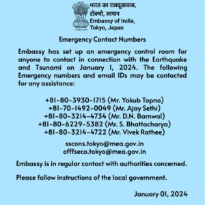 ସମ୍ବେଦନଶୀଳ ତଥା ଚିନ୍ତାଜନକ ଦୃଶ୍ୟ ମଧ୍ୟରେ ବିପର୍ଯ୍ୟୟ ଦ୍ୱାରା ପ୍ରଭାବିତ ଲୋକଙ୍କୁ ସାହାଯ୍ୟ କରିବା ପାଇଁ ଭାରତୀୟ ଦୂତାବାସ ଦ୍ୱାରା ଜରୁରୀକାଳୀନ ହେଲ୍ପଲାଇନ ନମ୍ବର ଜାରି କରାଯାଇଛି। ଯୋଗାଯୋଗ ପାଇଁ ଭାରତୀୟ ଦୂତାବାସ ଏକ ଇ-ମେଲ ଠିକଣା ମଧ୍ୟ ଜାରି କରିଛି। ୟାକୁବ ଟପ୍ନୋ, ଅଜୟ ସେଠୀ ଏବଂ ଡି.ଏନ ବର୍ନୱାଲଙ୍କ ବ୍ୟତୀତ ଏସ ଭଟ୍ଟାଚାର୍ଯ୍ୟ ଏବଂ ବିବେକ ରାଠିଙ୍କ ନମ୍ବର ଜାରି କରାଯାଇଛି।