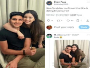ସୋସିଆଲ ମିଡିଆରେ ଭାଇରାଲ ହେଉଥିବା ଫଟୋରେ ସାରା ତେନ୍ଦୁଲକର ତାଙ୍କ ତଥାକଥିତ ପ୍ରେମିକ ତଥା ଭାରତୀୟ କ୍ରିକେଟର ଶୁଭମନ ଗିଲଙ୍କ ବେକରେ ହାତ ଥିବା ଦେଖିବାକୁ ମିଳିଛି। ଧୋନି ପୋପା ନାମକ ଜଣେ ୟୁଜର୍ସ ଏହି ଫଟୋ ଶେୟାର କରିଛନ୍ତି। ଏଥିସହ ଏହାର କ୍ୟାପସନରେ ଲେଖା ଅଛି – ସାରା ନିଶ୍ଚିତ କରିଛନ୍ତି ଯେ ସେ ଶୁଭମନ ଗିଲଙ୍କୁ ଡେଟ କରୁଛନ୍ତି। ଏହି ପୋଷ୍ଟ ପରେ ସୋସିଆଲ ମିଡିଆରେ ଏହି ଫଟୋ ଭାଇରାଲ ହୋଇଛି। ତେବେ ଅନ୍ୟ ଜଣେ ୟୁଜର୍ସ ସମାନ ଫଟୋ ଉପରେ କମେଣ୍ଟ ଦେଇ ସତ୍ୟ ପ୍ରକାଶ କରିଛନ୍ତି। ୟୁଜର୍ସ ସାରାଙ୍କ ପ୍ରକୃତ ଫଟୋ ଶେୟାର କରିଛନ୍ତି ଏବଂ କହିଛନ୍ତି ଯେ ଏହି ଫଟୋ ଫେକ୍। ସାରା ଶୁଭମନ ଗିଲଙ୍କ ସହ ନୁହେଁ ବରଂ ତାଙ୍କ ଭାଇ ଅର୍ଜୁନ ତେନ୍ଦୁଲକରଙ୍କ ବେକରେ ହାତ ପକାଇଛନ୍ତି।