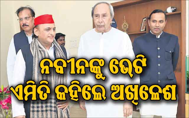 ଏହାପରେ ସେ ସ୍ଥାନୀୟ ଏକ ଘରୋଇ ହୋଟେଲକୁ ଯାଇ ସେଠାରେ ମଧ୍ୟାହ୍ନଭୋଜନ କରିବା ପରେ ବିରୋଧୀ ଦଳ ନେତା ତଥା ବିଜେଡି ସଭାପତି ନବୀନ ପଟ୍ଟନାୟକଙ୍କୁ ଭେଟିବା ଲାଗି ନବୀନ ନିବାସରେ ପହଞ୍ଚିଥିଲେ। ସେଠାରେ ପ୍ରାୟ ୩୦ ମିନିଟ୍ ନବୀନଙ୍କ ସହ ବିଭିନ୍ନ ପ୍ରସଙ୍ଗରେ ଆଲୋଚନା କରିଥିଲେ। ମିଳିଥିବା ସୂଚନା ମୁତାବକ, ନବୀନଙ୍କୁ ବୈଠକ ସମୟରେ ଦେଶର ଜଣେ ବଡ଼ ନେତା ବୋଲି ଅଖିଳେଶ କହିବା ସହ ଜାତୀୟ ପ୍ରସଙ୍ଗରେ ମୁହଁ ଖୋଲି ନିଜର ଗୁରୁତ୍ୱ ଜାରି କରିବାକୁ କୁଆଡ଼େ ପ୍ରସ୍ତାବ ଦେଇଥିବା ଜଣାପଡିଛି। ନବୀନଙ୍କୁ ଭେଟିବା ପରେ ଅଖିଳେଶ କହିଛନ୍ତି, ବିଜୁ ପଟ୍ଟନାୟକ ଏବଂ ତାଙ୍କ ପୁଅ ନବୀନ ପଟ୍ଟନାୟକ ଓଡ଼ିଶାର ବହୁ ବିକାଶ କରିଛନ୍ତି। ରାଜ୍ୟରେ ବୁଲିଲେ ବିଜେଡି ଶାସନ ସମୟରେ କେତେ ବିକାଶ ହୋଇଛି ତାହା ଦେଖାଯାଉଛି। ନବୀନ ଏବଂ ସେ କୌଣସି ନା କୌଣସି ବାଟରେ ଭାଜପା ସହ ଲଢୁଛନ୍ତି। ବିଜୁ ବାବୁଙ୍କ ସହ ଅଖିଳେଶଙ୍କ ବାପାଙ୍କର ରହିଥିବା ସମ୍ପର୍କ ବିଷୟରେ ମଧ୍ୟ ସେ କହିଥିଲେ। ଆଗକୁ ଥିବା ୪ ରାଜ୍ୟ ସଭା ଆସନ ଭୋଟିଂ ପୂର୍ବରୁ ଓଡ଼ିଶାକୁ ଅଖିଳେଶଙ୍କ ଗସ୍ତ ଏବଂ ନବୀନଙ୍କ ସାଙ୍ଗରେ ସାକ୍ଷାତ ଭିନ୍ନ ସଙ୍କେତ ଦେଉଥିବା ରାଜନୈତିକ ମହଲରେ ଚର୍ଚ୍ଚା ହେଉଛି। ଏହାପରେ ଅଖିଳେଶ ରହୁଥିବା ଘରୋଇ ହୋଟେଲରେ ବହୁ ବରିଷ୍ଠ ନେତାଙ୍କୁ ଭେଟି ବିଭିନ୍ନ ପ୍ରସଙ୍ଗରେ ଆଲୋଚନା କରିଥିଲେ। ଶନିବାର ବୁଦ୍ଧିଜୀବୀଙ୍କ ସହ ତାଙ୍କର ଏକ ଆଲୋଚନା କାର୍ଯ୍ୟକ୍ରମ ରହିଥିବା ଜଣାପଡ଼ିଛି।
