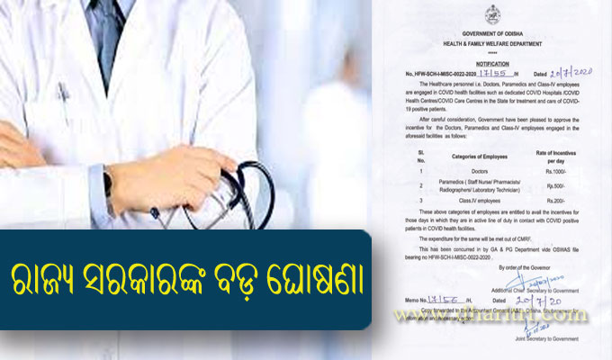 ଡାକ୍ତରମାନଙ୍କୁ ଦୈନିକ ୧ ହଜାର ଟଙ୍କା, ନର୍ସ, ଫାର୍ମାସିଷ୍ଟ, ରେଡିଓଗ୍ରାଫର, ପରୀକ୍ଷାଗାରର ଟେକ୍ନିସିଆନମାନଙ୍କୁ ଦୈନିକ ୫ ଶହ ଟଙ୍କା ଲେଖାଏ ପ୍ରୋତ୍ସାହନ ରାଶି ମିଳିବ।