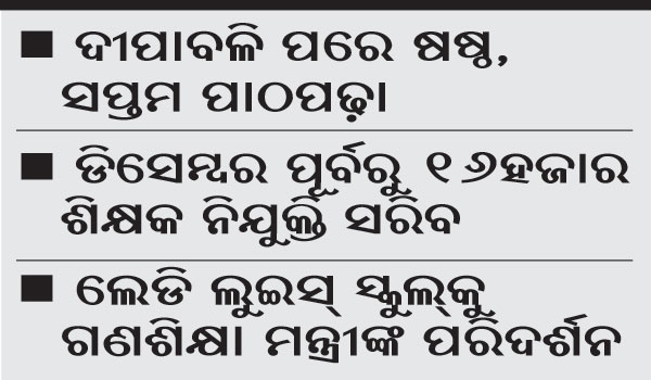 ଭୁବନେଶ୍ୱର/ସମ୍ବଲପୁର ୪।୧୧(ବ୍ୟୁରୋ): ଦୀପାବଳି ପରେ ପ୍ରାଥମିକ ସ୍କୁଲ ଖୋଲିବା ପାଇଁ ରାଜ୍ୟ ସରକାର ନିଷ୍ପତ୍ତି ନେଇଛନ୍ତି। ତେବେ ପ୍ରଥମ ପର୍ଯ୍ୟାୟରେ ଷଷ୍ଠ ଓ ସପ୍ତମ ଶ୍ରେଣୀ ଖୋଲିବାକୁ ଚିନ୍ତା କରାଯାଉଛି। ପରବର୍ତ୍ତୀ ପର୍ଯ୍ୟାୟରେ ପ୍ରଥମରୁ ପଞ୍ଚମ ଶ୍ରେଣୀ ଖୋଲିବା ଉପରେ ବିଚାର କରାଯିବ। ତେବେ ନୂଆବର୍ଷ ସୁଦ୍ଧା ରାଜ୍ୟର ସବୁ ସ୍କୁଲ ଖୋଲିଯିବ ବୋଲି ବିଦ୍ୟାଳୟ ଓ ଗଣଶିକ୍ଷା ବିଭାଗ ମନ୍ତ୍ରୀ ସମୀର ରଞ୍ଜନ ଦାଶ ସୂଚନା ଦେଇଛନ୍ତି।