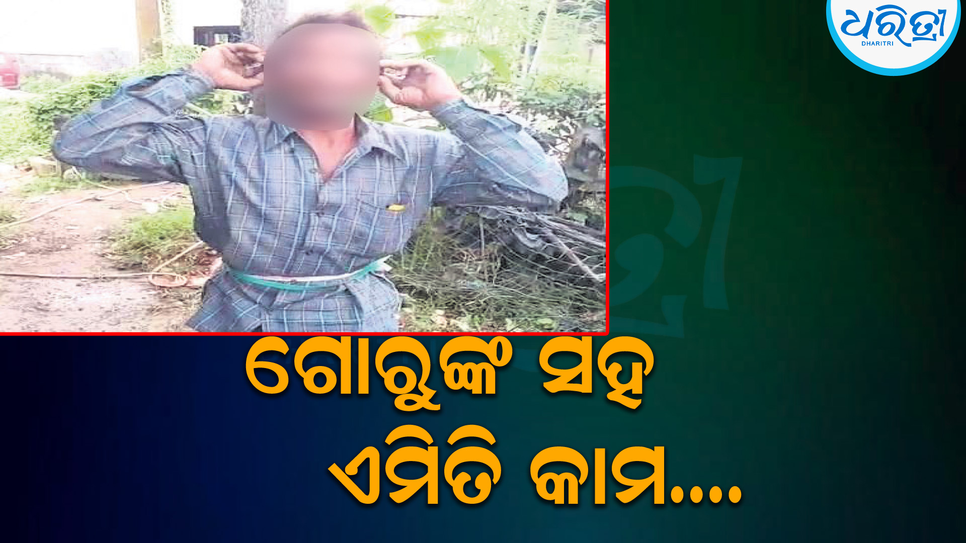 ପ୍ରକାଶ ଯେ, ସଦର ଥାନା ଅଧୀନ ମେଘଡମ୍ବରୁ ଅଞ୍ଚଳରେ ଏକ ନିର୍ମାଣାଧୀନ ଏକ ଆପାର୍ଟମେଣ୍ଟରେ ପଶ୍ଚିମବଙ୍ଗ ମୁର୍ଶିଦାବାଦ ଅଞ୍ଚଳର ୪୦ରୁ ୫୦ ଜଣ ରାଜମିସ୍ତ୍ରି ଓ ଶ୍ରମିକ କାର୍ଯ୍ୟ କରୁଛନ୍ତି। ଶ୍ରମିକମାନେ ସେଠାରେ ରହିଆସୁଛନ୍ତି। ସେମାନଙ୍କ ମଧ୍ୟରୁ ଜଣେ ଯୁବକ ଏକ ଗାଈ ସହ ଅପ୍ରାକୃତିକ ଯୌନ କ୍ରିୟା କରୁଥିବା ସ୍ଥାନୀୟ ଲୋକେ ଦେଖିବାକୁ ପାଇଥିଲେ। ଲୋକେ ରୁଣ୍ଡ ହୋଇ ଯୁବକ ଜଣକୁ ବିଦ୍ୟୁତ୍ ଖୁଣ୍ଟରେ ବାନ୍ଧି ନିସ୍ତୁକ ମାଡ଼ ମାରିଥିଲେ। ପୋଲିସ ପହଞ୍ଚତ୍ ଉତ୍ତ୍ୟକ୍ତ ଲୋକଙ୍କୁ ବୁଝାଶୁଝା କରିଥିଲା। ତଦନ୍ତ ପରେ କାର୍ଯ୍ୟାନୁଷ୍ଠାନ ଗ୍ରହଣ କରାଯିବ ବୋଲି ପ୍ରତିଶ୍ରୁତି ମିଳିବା ପରେ ପରିସ୍ଥିତି ସ୍ବାଭାବିକ ହୋଇଥିଲା।