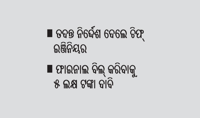 ୨୦୧୮-୧୯ ବର୍ଷରେ ୧.୩୩ କୋଟି ଟଙ୍କା ବ୍ୟୟରେ ଆର୍ଡି ରାସ୍ତାଠାରୁ ଡୁବିଖାଲ ପର୍ଯ୍ୟନ୍ତ ପିଏମ୍ଜିଏସ୍ୱାଇ ରାସ୍ତା ନିର୍ମାଣ ହୋଇଥିଲା, ଯାହାକି ୨୫ା୬ା୨୦୨୧ରେ ସମ୍ପୂର୍ଣ୍ଣ ହୋଇଥିଲା। କାର୍ଯ୍ୟର ଫାଇନାଲ ବିଲ୍ କରିଦେବାକୁ ସମ୍ପୃକ୍ତ ଯନ୍ତ୍ରୀ ୫ ଲକ୍ଷ ଟଙ୍କା ଦାବି କରିଥିଲେ ବୋଲି ଠିକାଦାର ପ୍ରଦୀପ୍ତ କୁମାର ବିଶ୍ୱାଳ ପିଏମ୍ଜିଏସୱାଇ ଚିଫ୍ ଇଞ୍ଜିନିୟରଙ୍କ ନିକଟରେ ୮ା୮ା୨୦୨୨ରେ ଅଭିଯୋଗ କରିଛନ୍ତି। ଯନ୍ତ୍ରୀଙ୍କ ଦାବିକୁ ସେ ନ ମାନିବାରୁ ଫାଇନାଲ ବିଲ୍ ପ୍ରସ୍ତୁତିରେ ଚଞ୍ଚକତା କରାଯାଇଛି। ପ୍ରାୟ ୩୨ ଲକ୍ଷ ଟଙ୍କା ବିଲ୍ କରିବାକୁ ଥିବାବେଳେ ବିନା କାରଣରେ ମାତ୍ର ୧୨ ଲକ୍ଷ ଟଙ୍କା ବିଲ୍ ହୋଇଥିଲା। ଯନ୍ତ୍ରୀଙ୍କ ଏଭଳି କାର୍ଯ୍ୟ ଉପରେ ସେ ୧୦ା୨ା୨୦୨୨ରେ ଗ୍ରାମ୍ୟ ଉନ୍ନୟନ ବିଭାଗର ଅତରିକ୍ତ ସଚିବଙ୍କ ନିକଟରେ ଗ୍ରୀଭାନ୍ସ ପିଟିସନ ଦାଖଲ କରିଥିଲେ। ତଥାପି କୌଣସି ପଦକ୍ଷେପ ନିଆଯାଇ ନ ଥିଲା। ଏହାପରେ ପିଏମ୍ଜିଏସ୍ୱାଇର ଚିଫ୍ ଇଞ୍ଜିନିୟର ୧୭ା୮ା୨୦୨୨ରେ କେନ୍ଦ୍ରାପଡା-ଯାଜପୁର ଗ୍ରାମ୍ୟ ନିର୍ମାଣ ସର୍କିଲର ଚିଫ୍ କନଷ୍ଟ୍ରକ୍ସନ ଇଞ୍ଜିନିୟରଙ୍କୁ ଅଭିଯୋଗ ଅନୁସାରେ ଉତ୍ତର ରଖିବାକୁ ନିର୍ଦ୍ଦେଶ ଦେଇଥିଲେ। ଏହି ନିର୍ଦ୍ଦେଶକୁ ଭିତ୍ତିକରି ୨୨ା୮ା୨୦୨୨ରେ କେନ୍ଦ୍ରାପଡ଼ା-ଯାଜପୁର ଗ୍ରାମ୍ୟ ନିର୍ମାଣ ସର୍କିଲର ଚିଫ୍ କନଷ୍ଟ୍ରକ୍ସନ ଇଞ୍ଜିନିୟର ଆବଶ୍ୟକ ତଦନ୍ତ କରିବାକୁ ଯାଜପୁର ଅଧୀକ୍ଷଣ ଯନ୍ତ୍ରୀଙ୍କୁ ନିର୍ଦ୍ଦେଶ ଜାରି କରିଛନ୍ତି।