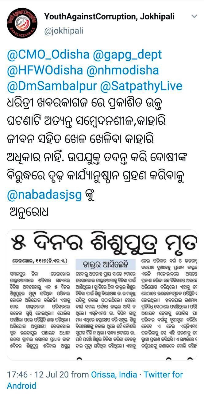 ବରଗଡ଼ ଅଫିସ୍/ରେଢ଼ାଖୋଲ,୧୨।୭-ସମ୍ବଲପୁର ଜିଲା ରେଢ଼ାଖୋଲ ଉପଖଣ୍ଡ ଡାକ୍ତରଖାନାରେ ଚିକିତ୍ସା ଅବହେଳାରୁ ଶିଶୁପୁତ୍ରର ମୃତ୍ୟୁ ଘଟଣା ଆଲୋଡ଼ନ ଖେଳାଇ ଦେଇଛି। ଚିକିତ୍ସାରେ ଅବହେଳା କରିଥିବା ଡାକ୍ତରଙ୍କ ବିରୋଧରେ କାର୍ଯ୍ୟାନୁଷ୍ଠାନ ନେବାକୁ ବିଭିନ୍ନ ମହଲରେ ଦାବି ହୋଇଛି । ରବିବାର ଏ ନେଇ ବରଗଡ଼ ଜିଲା ୟୁଥ୍ ଏଗେନଷ୍ଟ କରପ୍ସନ, ଯୋଖିପାଲି ପକ୍ଷରୁ ମୁଖ୍ୟମନ୍ତ୍ରୀ, ସ୍ବାସ୍ଥ୍ୟମନ୍ତ୍ରୀ, ସ୍ବାସ୍ଥ୍ୟ ଓ ପରିବାର କଲ୍ୟାଣ, ଜାତୀୟ ସ୍ବାସ୍ଥ୍ୟ ମିଶନ ଏବଂ ସମ୍ବଲପୁର ଜିଲାପାଳଙ୍କୁ ଟୁଇଟ୍ କରାଯାଇଛି। ଏଭଳି ଏକ ସମ୍ବେଦନଶୀଳ ଘଟଣାର ନିରପେକ୍ଷ ତଦନ୍ତ କରି ଦୋଷୀଙ୍କ ବିରୋଧରେ ଦୃଢ଼ କାର୍ଯ୍ୟାନୁଷ୍ଠାନ ନେବାକୁ ଅନୁରୋଧ କରାଯାଇଛି।