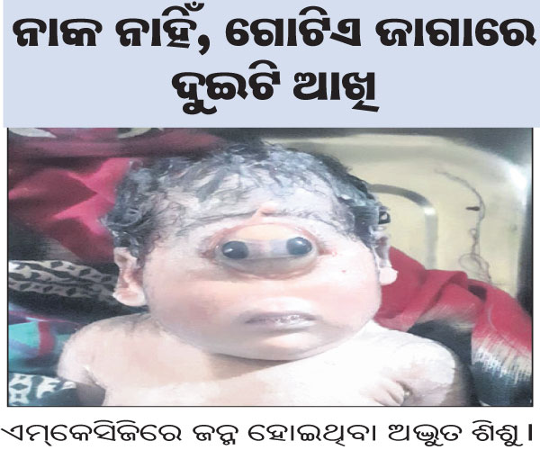 ବ୍ରହ୍ମପୁର ଅଫିସ,୧୭ା୬: ବ୍ରହ୍ମପୁର ବଡ଼ ମେଡିକାଲରେ ବୁଧବାର ଏକ ଅଦ୍ଭୁତ ଶିଶୁ ଜନ୍ମ ହୋଇଛି। ଶିଶୁର ନାକ ନ ଥିବା ବେଳେ ଗୋଟିଏ ଜାଗାରେ ଦୁଇଟି ଆଖି ରହିଛି। ଶିଶୁକନ୍ୟାଟି ମୃତ ଅବସ୍ଥାରେ ଜନ୍ମ ହୋଇଥିବା ଏମ୍‌କେସିଜି ମେଡିକାଲ ବରିଷ୍ଠ ଶିଶୁରୋଗ ବିଶେଷଜ୍ଞ ଡା.ସୁନୀଲ କୁମାର ଅଗ୍ରୱାଲ୍‌ ସୂଚନା ଦେଇଛନ୍ତି। ଏଭଳି ଅଦ୍ଭୁତ ଶିଶୁ ଜନ୍ମଗ୍ରହଣ ଏମ୍‌କେସିଜି ମେଡିକାଲରେ ପ୍ରଥମ ବୋଲି କୁହାଯାଉଛି। ଜେନେଟିକ୍‌ ସମସ୍ୟା ଯୋଗୁ ଶରୀର ଗଠନରେ ଅସୁବିଧା ଦେଖାଯିବା ସହ ଏଭଳି ସମସ୍ୟା ହୋଇଥାଏ ବୋଲି ଡା. ଅଗ୍ରୱାଲ କହିଛନ୍ତି। କନ୍ଧମାଳ ଜିଲା କ.ନୂଆଗଁା ଥାନା ଅନ୍ତର୍ଗତ ଡାମେରକିଆ ଗ୍ରାମର ଗୌତମ ଦୀପ୍‌ଙ୍କ ସ୍ତ୍ରୀ ଯସ୍ମିନ୍‌ଙ୍କୁ ସ୍ତ୍ରୀ ଓ ପ୍ରସୂତି ବିଭାଗରେ ଭର୍ତ୍ତି କରାଯାଇଥିଲା। ବୁଧବାର ମଧ୍ୟାହ୍ନରେ ସେ ପ୍ରସବ ବେଦନା ଅନୁଭବ କରିବାରୁ ତାଙ୍କୁ ଲେବର୍‌ ରୁମ୍‌କୁ ନିଆଯାଇଥିଲା। ସେଠାରେ ଡାକ୍ତରଙ୍କ ପରୀକ୍ଷା ପରେ ଗର୍ଭରେ ଥିବା ସନ୍ତାନର ସେଭଳି କୌଣସି ପ୍ରତିକ୍ରିୟା ଜଣାପଡ଼ୁ ନ ଥିଲା। ଏଣୁ ଶିଶୁଟିର ମୃତ୍ୟୁ ଘଟିଥିବା ଡାକ୍ତରମାନେ ଅନୁମାନ କରିଥିଲେ। ମା’ର ଜୀବନ ବଞ୍ଚାଇବା ପାଇଁ ଶେଷରେ ଅସ୍ତ୍ରୋପଚାର କରାଯାଇଥିଲା। ପରେ ଡାକ୍ତରମାନେ ଶିଶୁକୁ ମୃତ ଘୋଷଣା କରିଥିଲେ।