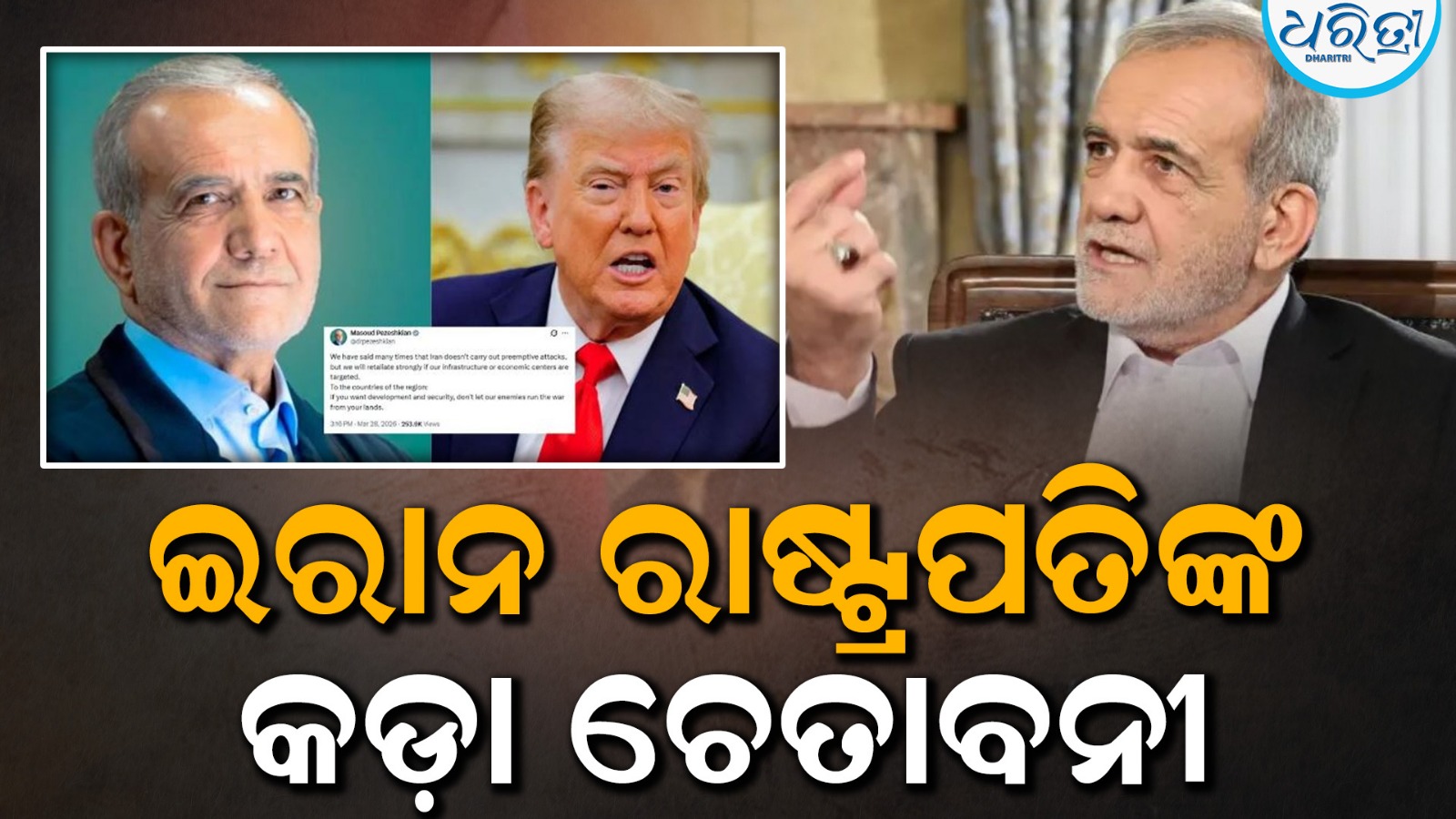 ତେହରନ୍,୨୮।୩: ମଧ୍ୟପ୍ରାଚ୍ୟରେ ଚାଲିଥିବା ଉତ୍ତେଜନା ଆରମ୍ଭ ହେବାର ଏକ ମାସ ବିତିଗଲାଣି। ଇରାନ ଏବଂ ଇସ୍ରାଏଲ ମଧ୍ୟରେ ନିରନ୍ତର କ୍ଷେପଣାସ୍ତ୍ର ଆକ୍ରମଣ ବିନିମୟ ହୋଇଛି। ଇରାନ ରାଷ୍ଟ୍ରପତି ମାସୁଦ ପେଜେଶକିୟାନ ତାଙ୍କ ସୋସିଆଲ ମିଡିଆ ହ୍ୟାଣ୍ଡେଲ ‘X’ ରେ ଏକ ପୋଷ୍ଟ ମାଧ୍ୟମରେ ଶତ୍ରୁ ରାଷ୍ଟ୍ରଗୁଡ଼ିକୁ ଏକ କଠୋର, ଖୋଲା ଚେତାବନୀ ଦେବା ପରେ ଏହି ସଂଘର୍ଷର ପରିସ୍ଥିତି ଆହୁରି ତୀବ୍ର ହୋଇଗଲା। ସ୍ପଷ୍ଟ ଭାବରେ ଆମେରିକା ଏବଂ ଇସ୍ରାଏଲର ନାମ ନେଇ ରାଷ୍ଟ୍ରପତି ସ୍ପଷ୍ଟ କରିଥିଲେ ଯେ ଇରାନକୁ କମ ଆକଳନ କରିବା ଏକ ଗୁରୁତର ଭୁଲ ପ୍ରମାଣିତ ହୋଇପାରେ। ତାଙ୍କ ପୋଷ୍ଟରେ, ସେ କହିଥିଲେ ଯେ ଇରାନ କେବେ ଆକ୍ରମଣ ଆରମ୍ଭ କରେ ନାହିଁ – ଅର୍ଥାତ, ଏହା ପୂର୍ବରୁ ଆକ୍ରମଣ କରେ ନାହିଁ – ଏହାର ସୀମା ମଧ୍ୟରେ ହେଉଥିବା ଯେକୌଣସି କ୍ଷତି ଭୟଙ୍କର ପରିଣାମ ଆଣିବ।